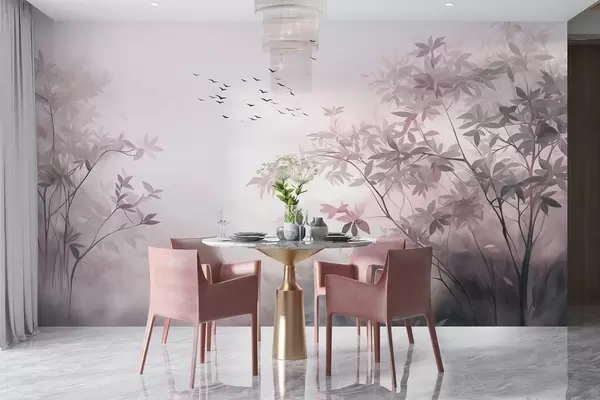 Фототапет Текстуриран пейзаж с дървета и ято птици, летящи в небето, пастелни цветове, природна сцена Nr w09418v1
