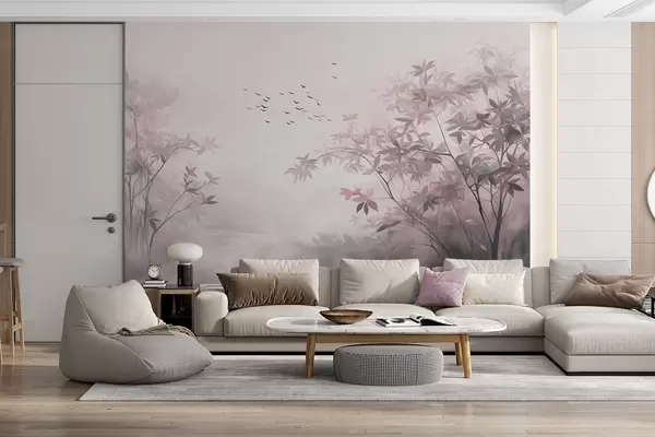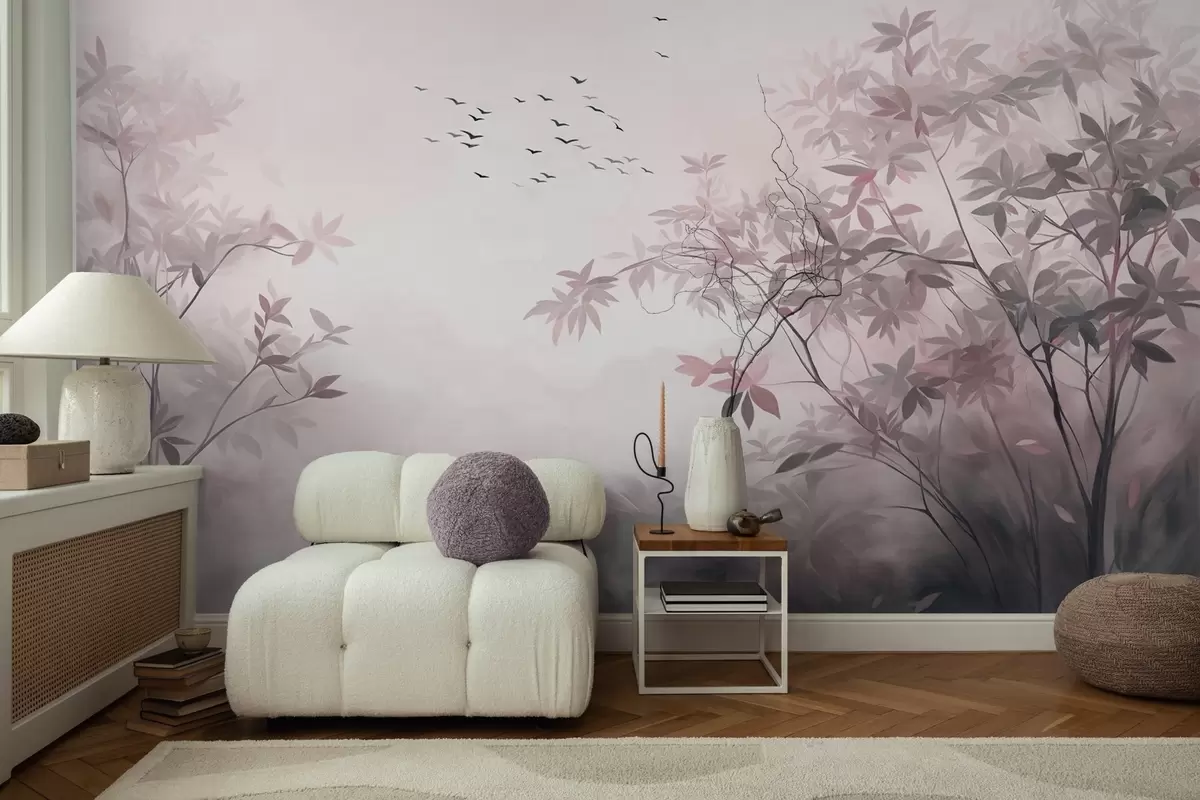 Фототапет Текстуриран пейзаж с дървета и ято птици, летящи в небето, пастелни цветове, природна сцена Nr w09418v1