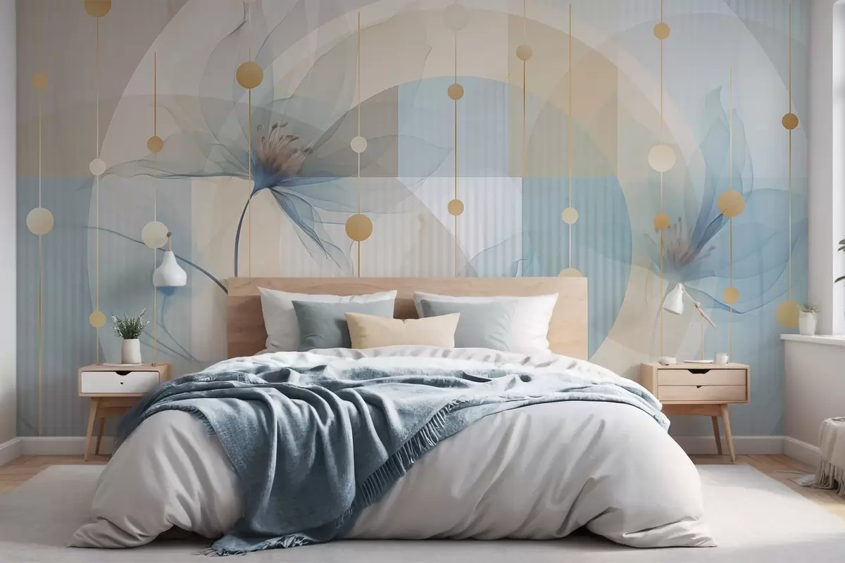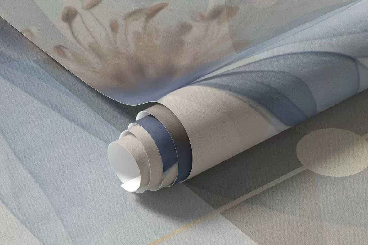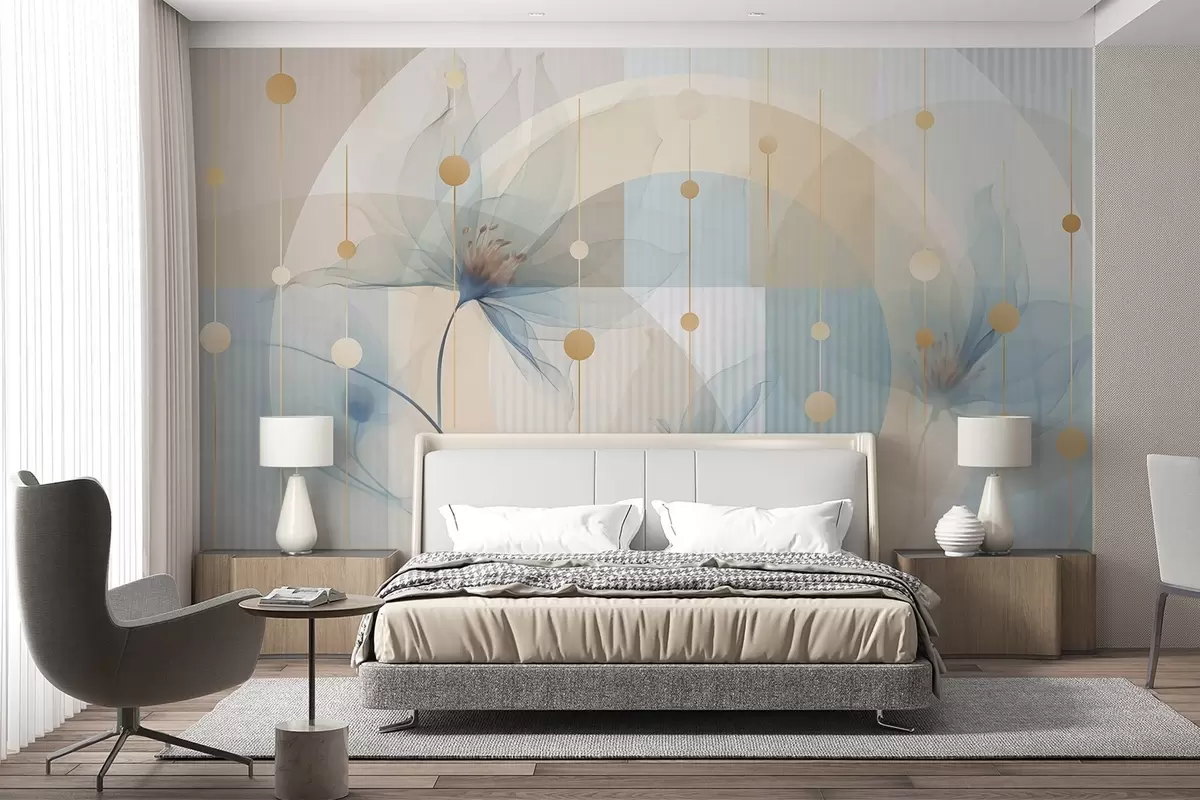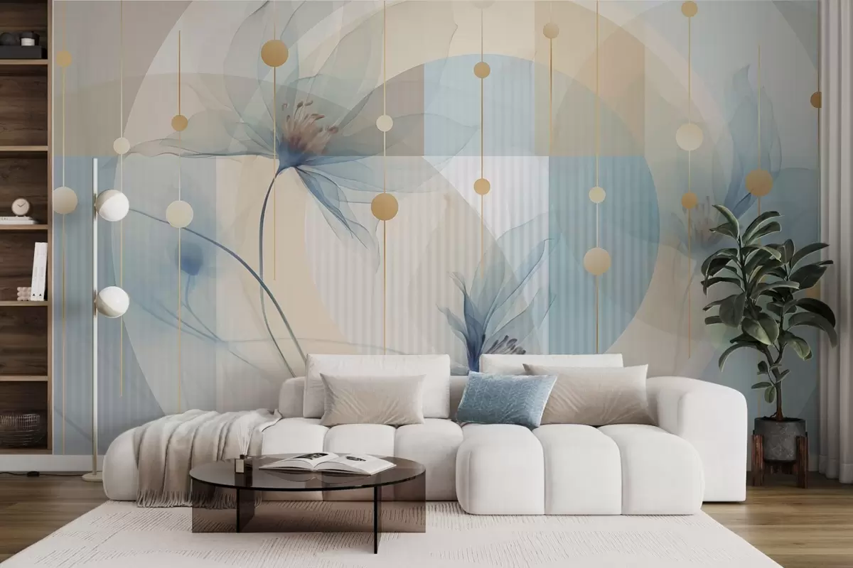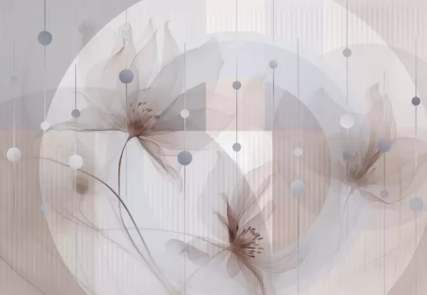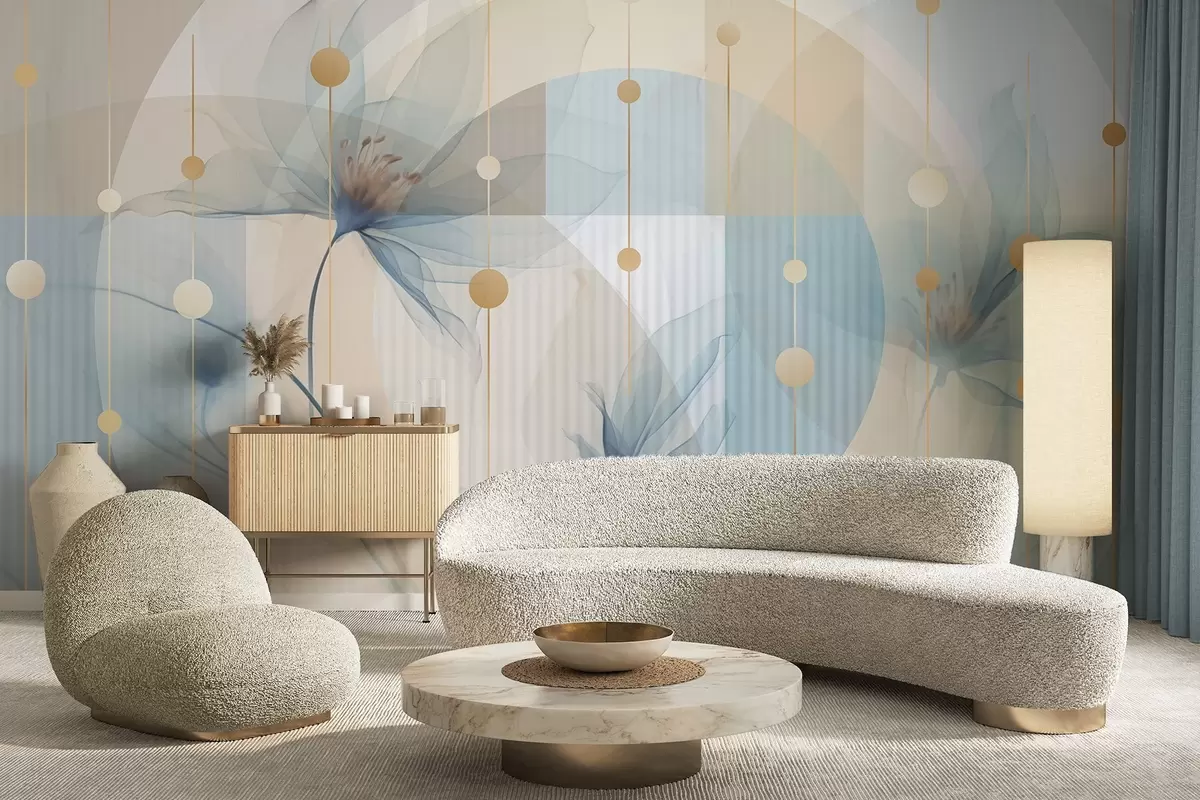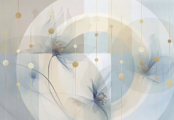 Фототапет Абстрактни прозрачни цветя, кръгове и геометрични форми, пастелно синьо, бежово и бяло цветова палитра Nr w09419