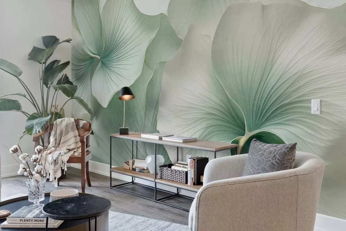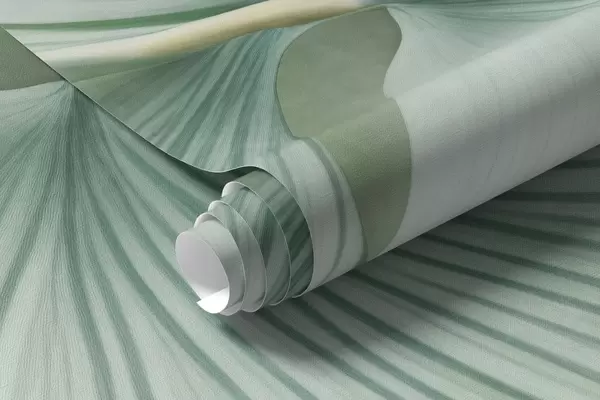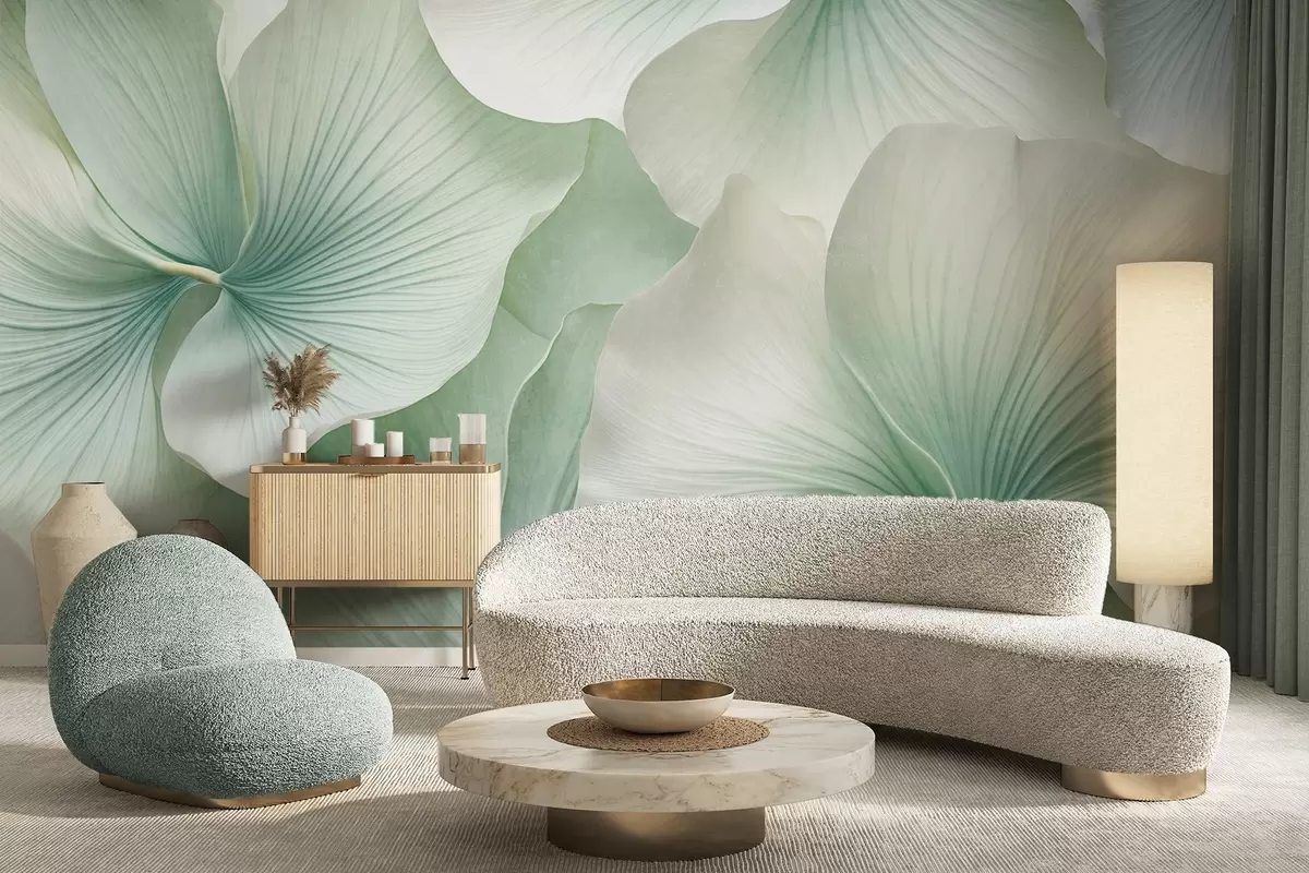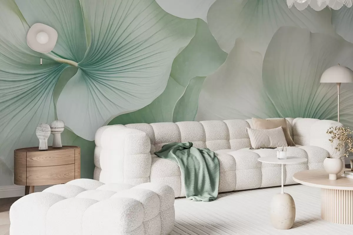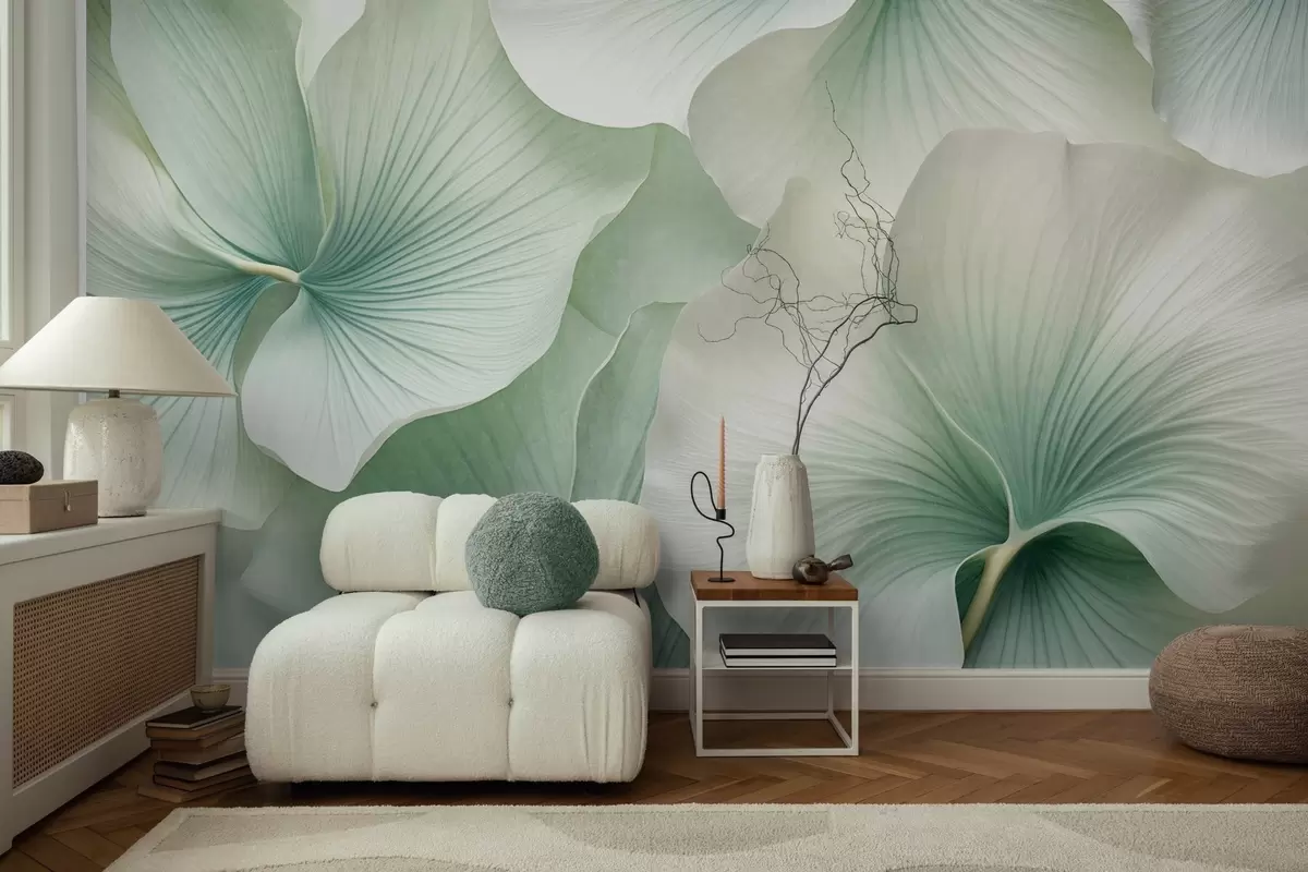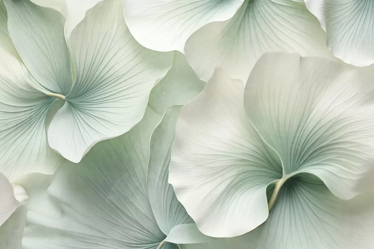 Фототапет Бели и зелени листа от гинко, мека текстура, абстрактен флорален фон, минималистичен модерен стил Nr w09421