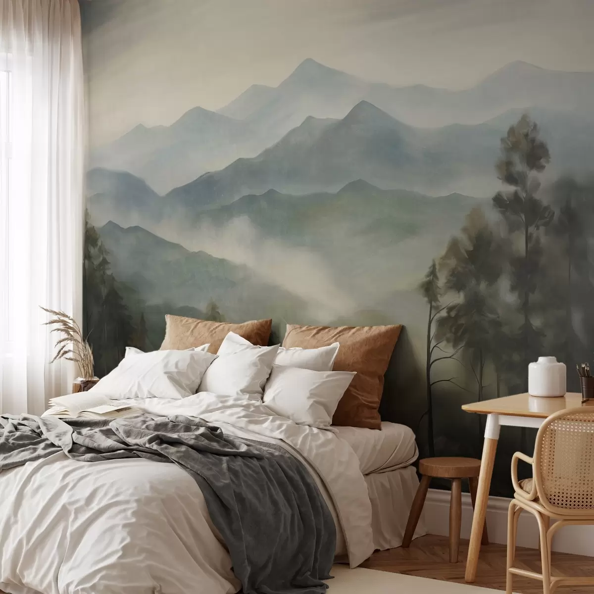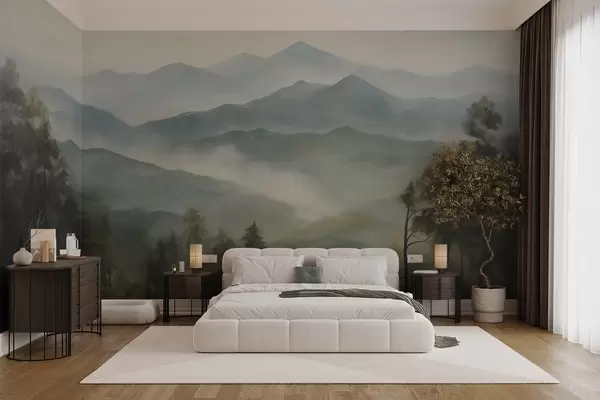Фототапет Мъглива планинска верига с дървета, мъгла, облачно небе, приглушени цветове, стил на пейзажна живопис Nr w09424