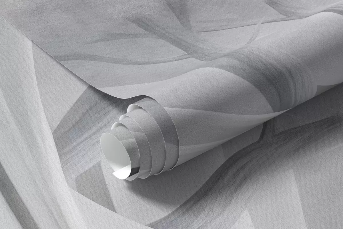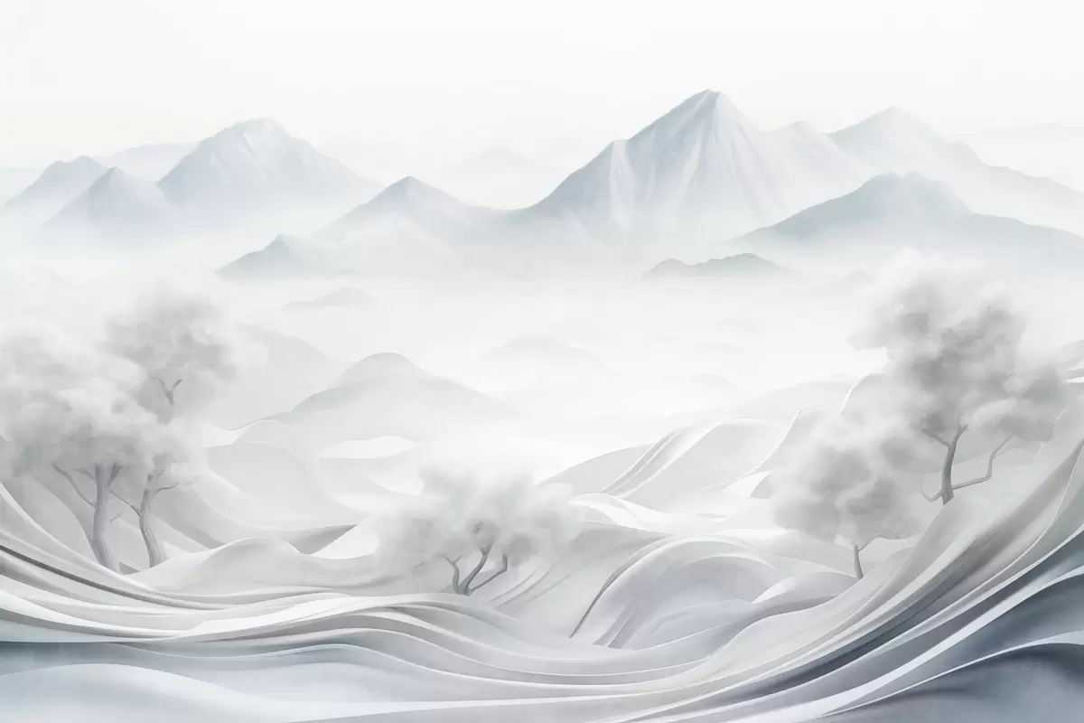 Фототапет Заснежен абстрактен декоративен планински пейзаж с бели дървета и мъгла, минималистичен текстуриран стил Nr w09426