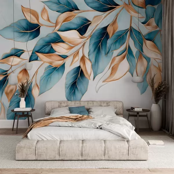 Фототапет Текстурирани сини и оранжеви листа, светлосин фон, елегантен и артистичен дизайн, модерен стил Nr w09429