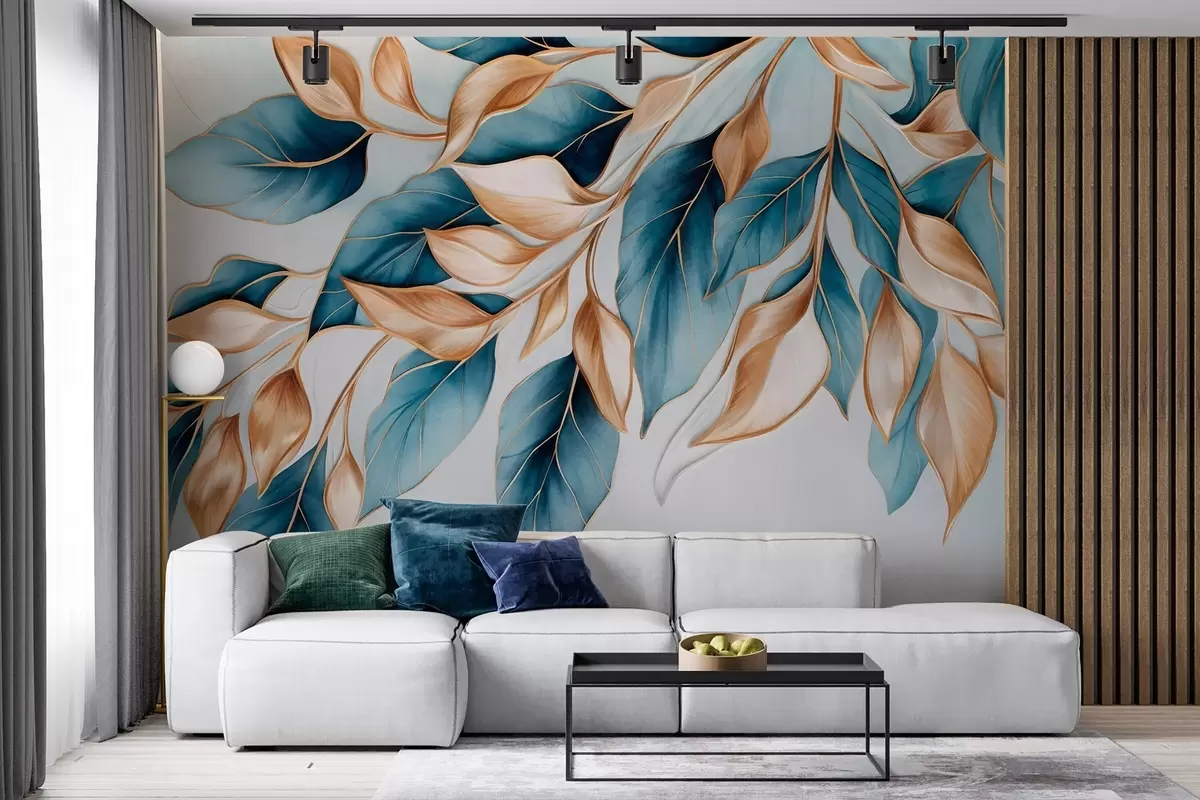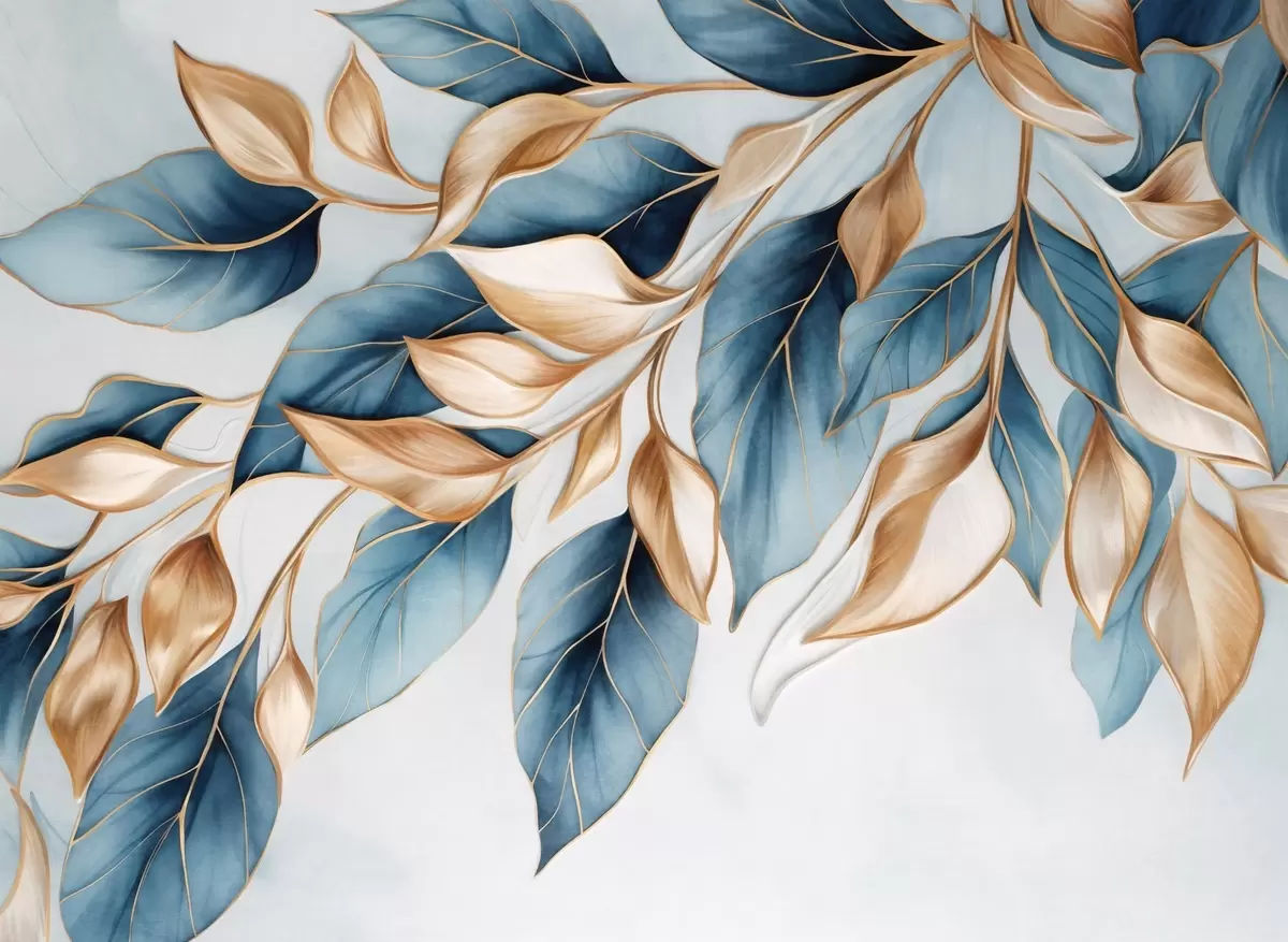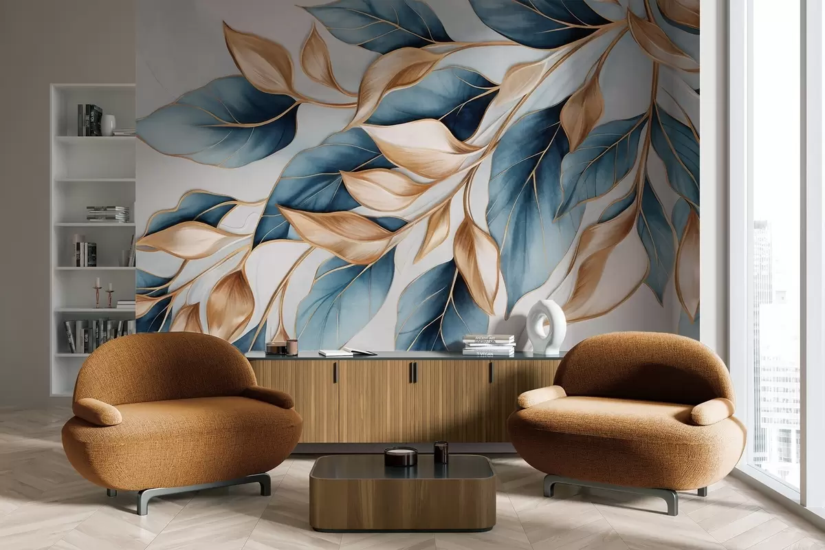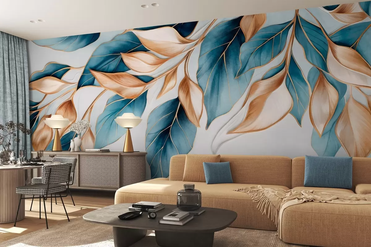 Фототапет Текстурирани сини и оранжеви листа, светлосин фон, елегантен и артистичен дизайн, модерен стил Nr w09429