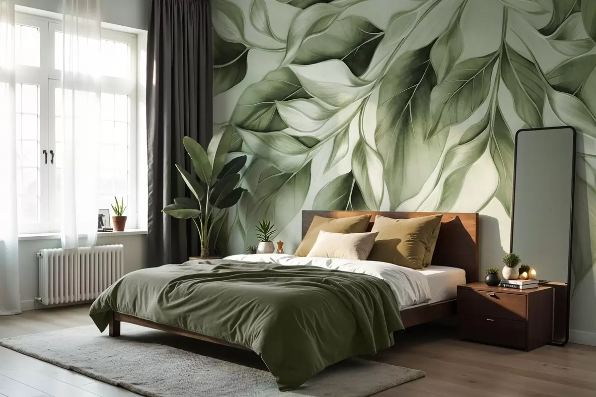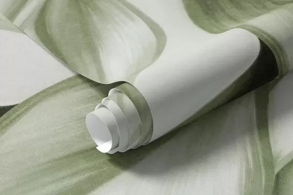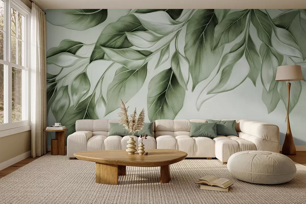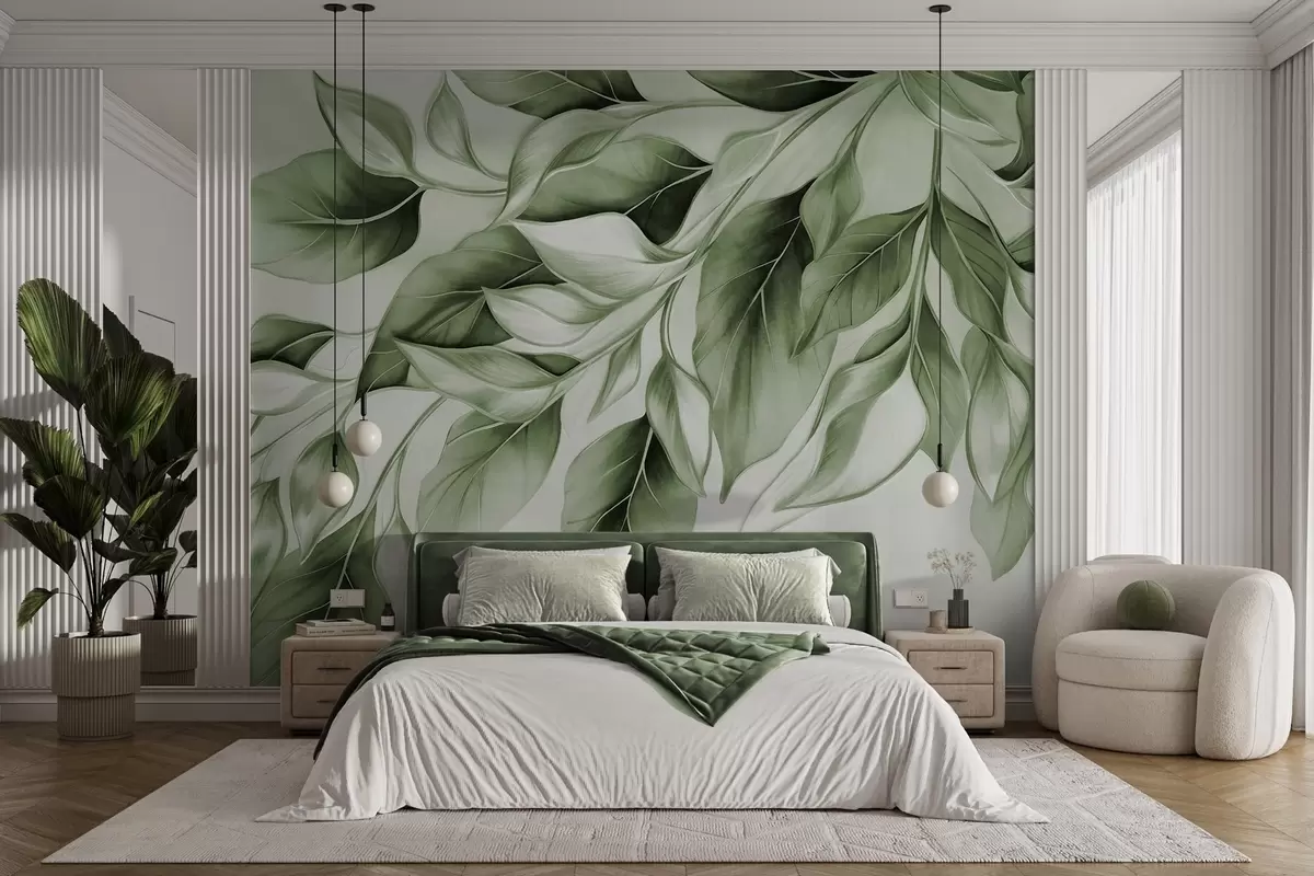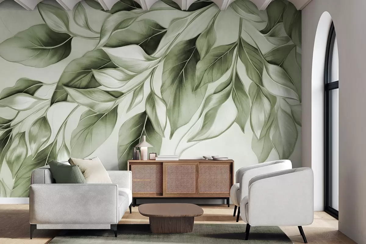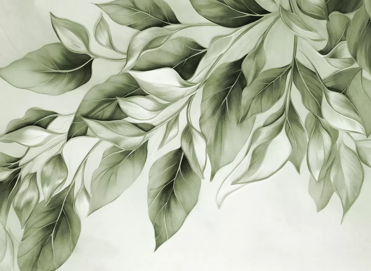 Фототапет Текстурирани листа в приглушен зелен цвят, светъл фон, елегантен и артистичен дизайн, модерен стил Nr w09429v1