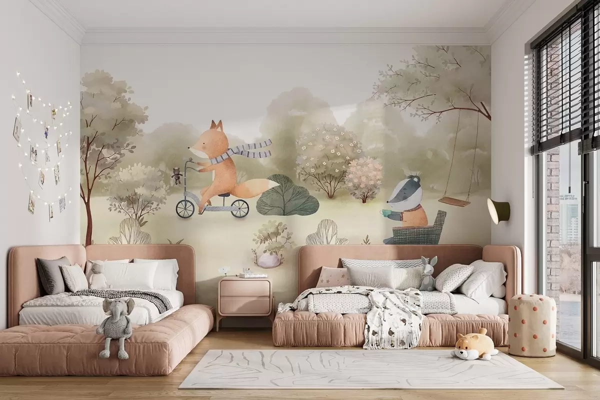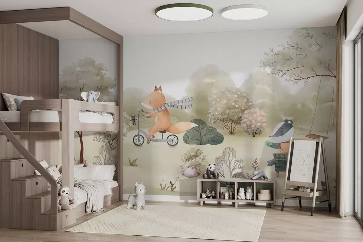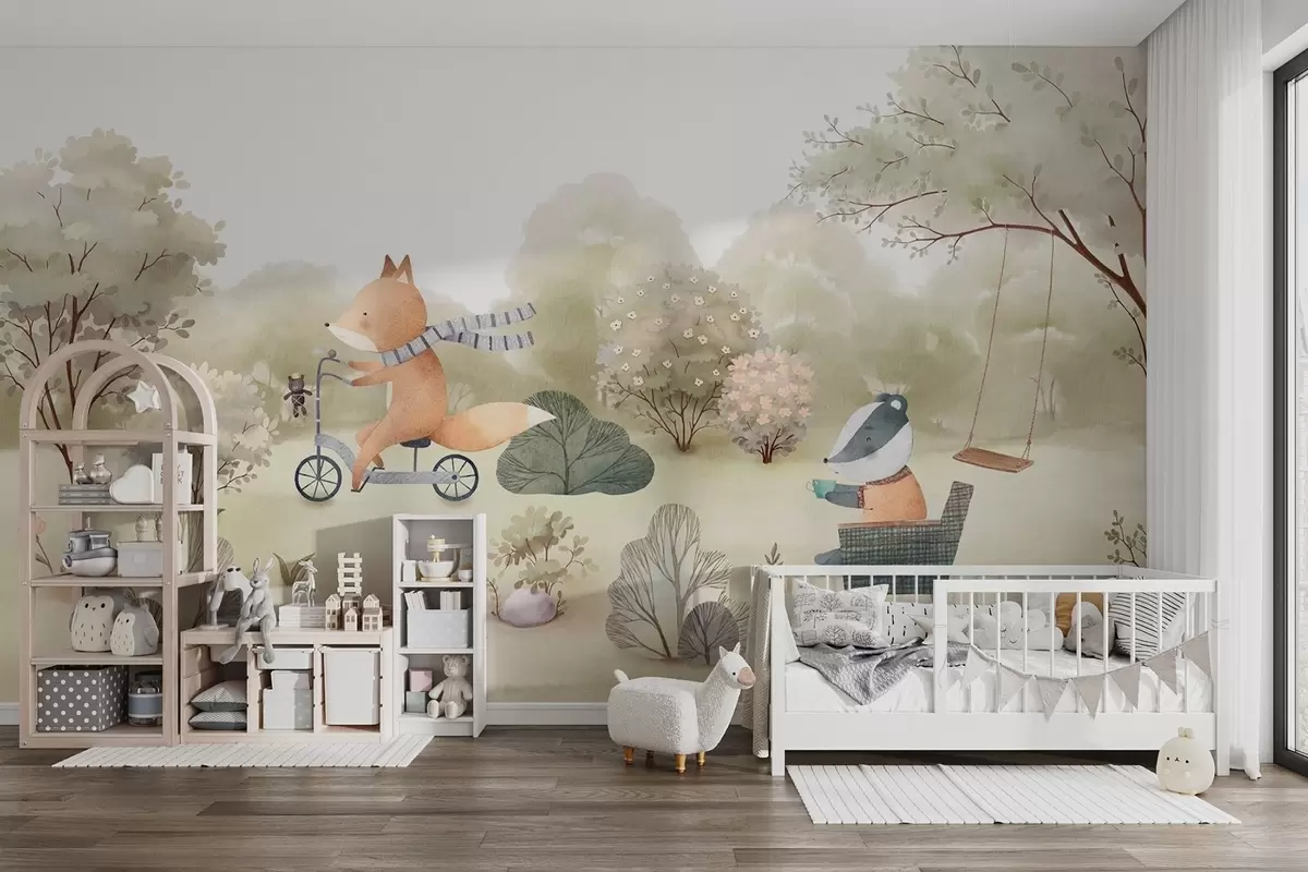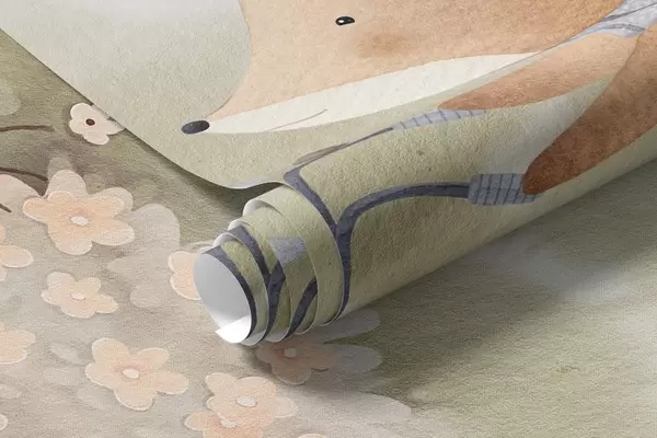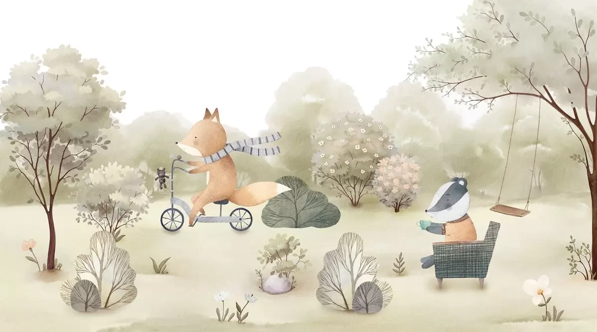 Фототапет Лисица на велосипед и язовец с чай, горски животни в акварелен стил Nr w09439