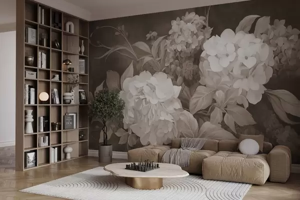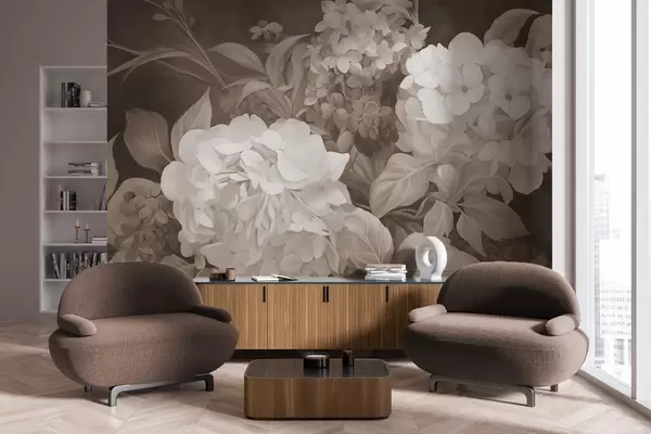 Фототапет Текстурирана сепия имитация на цветя от хортензия с големи листа, абстрактен и тъмен фон Nr w09465