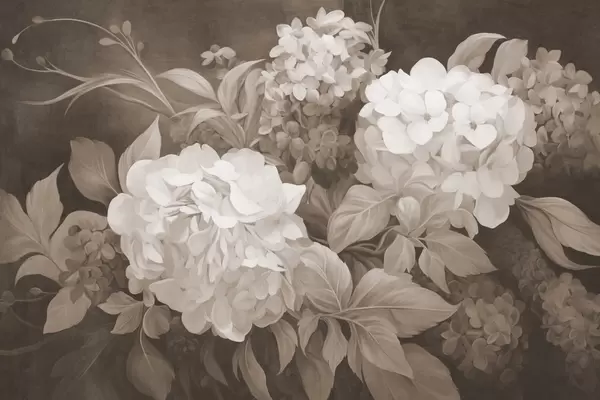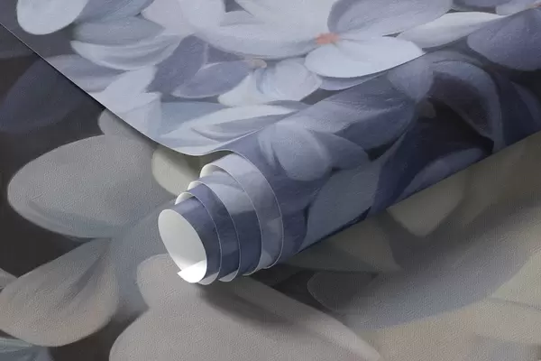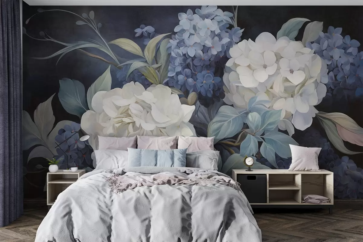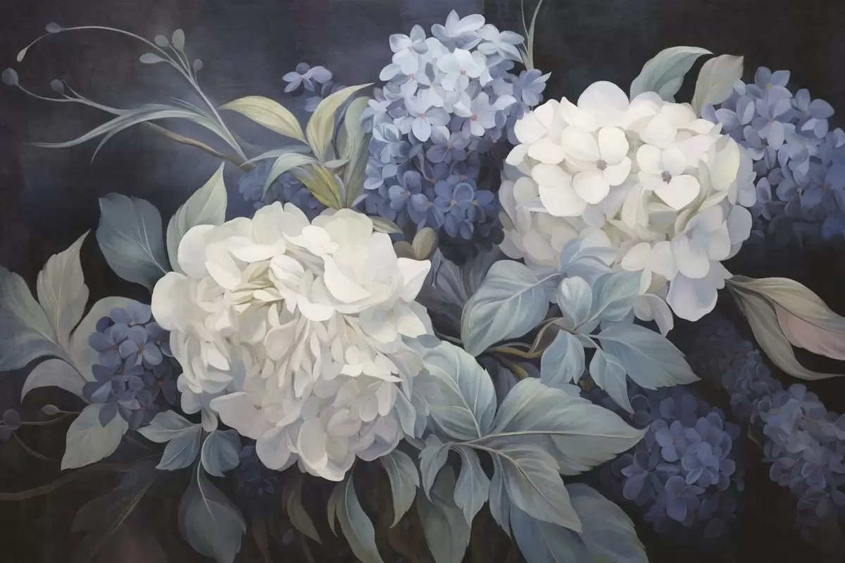 Фототапет Текстурирана тъмно синя картина, имитираща цветя от хортензия с големи листа, абстрактен и тъмен фон Nr w09465v1