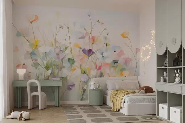 Фототапет Абстрактно поле от цветни цветя с дълги стъбла и зелени листа, текстурирани, пастелни, светли цветове Nr w09466