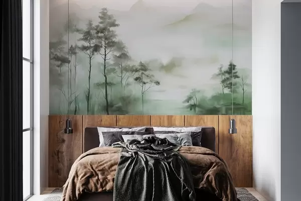 Фототапет Мъглив пейзаж с високи дървета и планини в приглушени зелени и сиви тонове, минималистичен стил, текстуриран Nr w09469