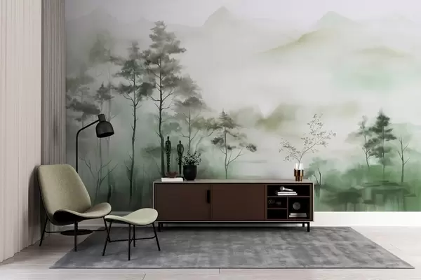 Фототапет Мъглив пейзаж с високи дървета и планини в приглушени зелени и сиви тонове, минималистичен стил, текстуриран Nr w09469