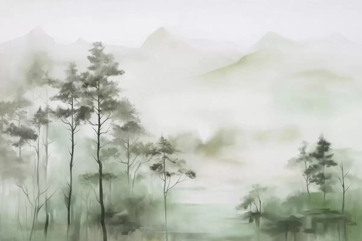 Фототапет Мъглив пейзаж с високи дървета и планини в приглушени зелени и сиви тонове, минималистичен стил, текстуриран Nr w09469