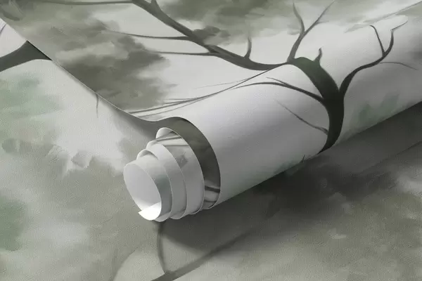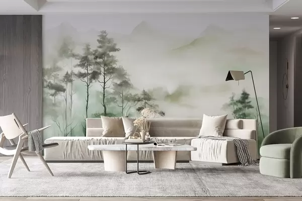 Фототапет Мъглив пейзаж с високи дървета и планини в приглушени зелени и сиви тонове, минималистичен стил, текстуриран w09469