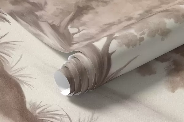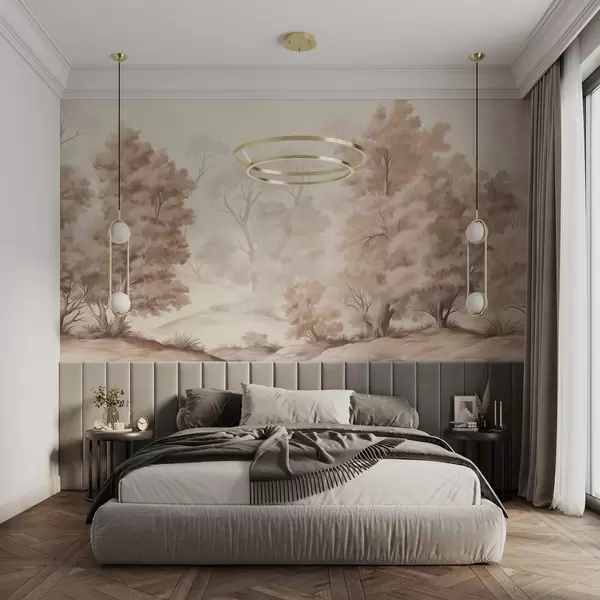 Фототапет Текстурирана пейзажна живопис, имитираща гора с високи дървета и трева, приглушени и меки цветове, успокояваща сцена Nr w09474