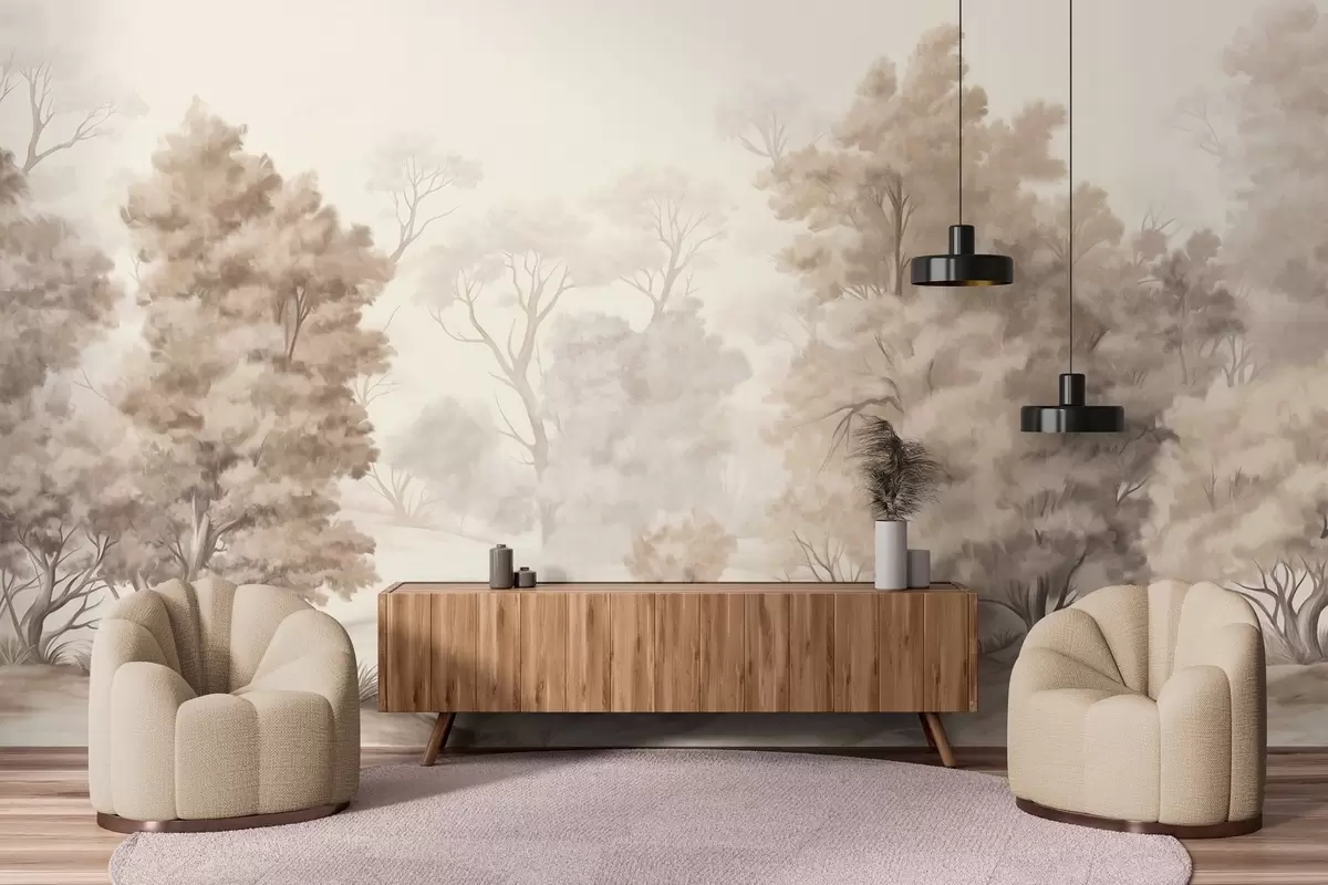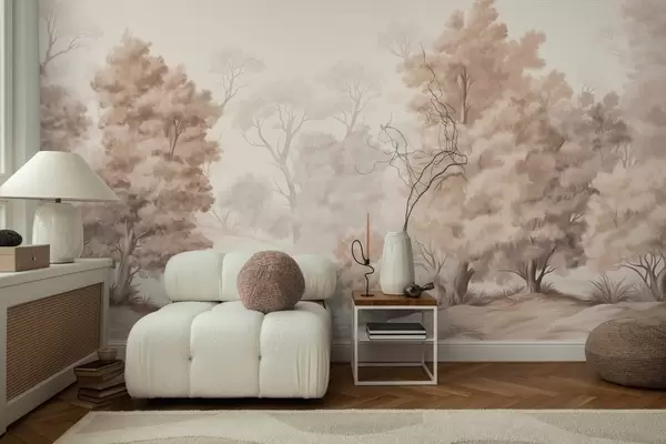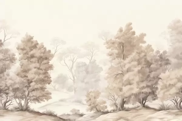 Фототапет Текстурирана пейзажна живопис, имитираща гора с високи дървета и трева, приглушени и меки цветове, успокояваща сцена Nr w09474