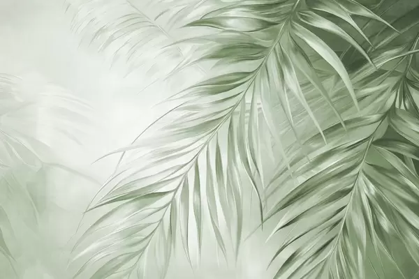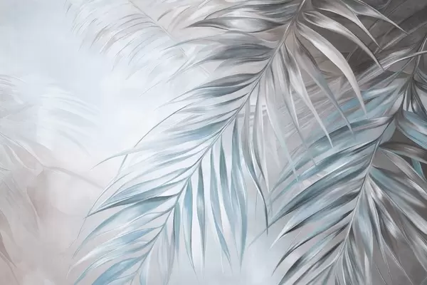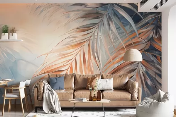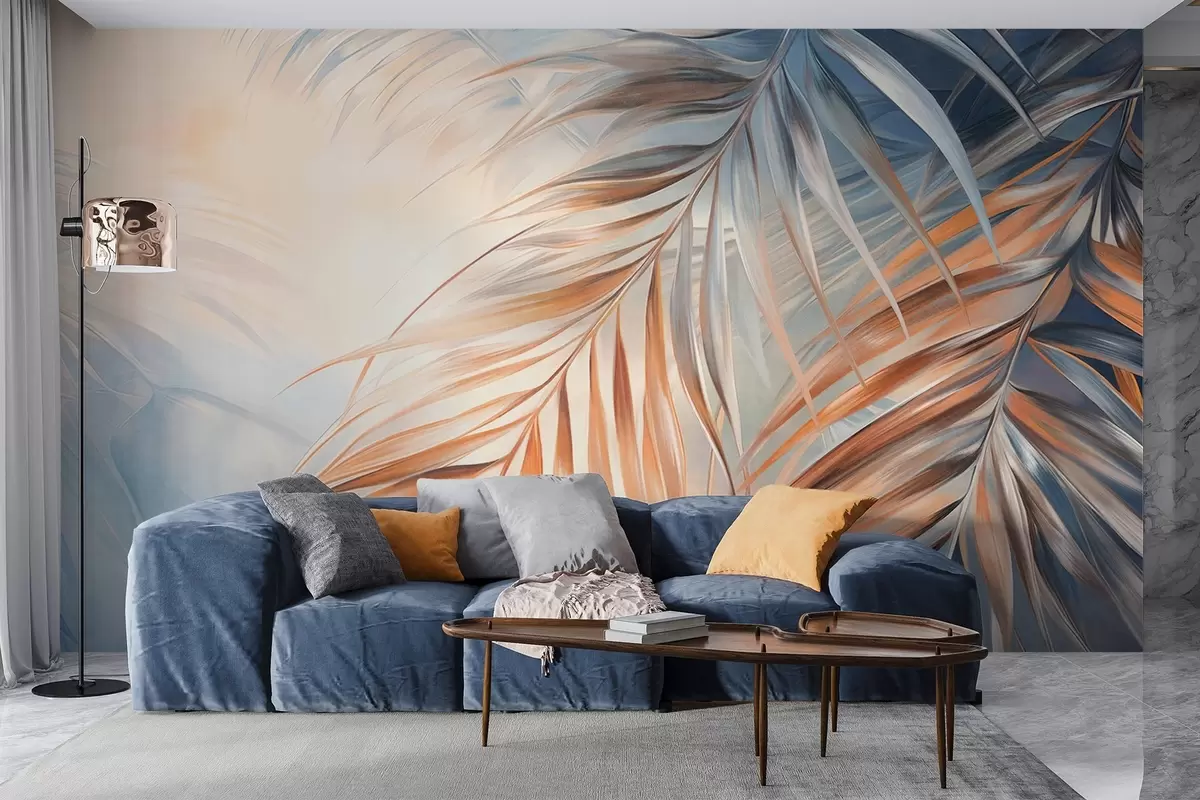 Фототапет Палмови листа с оранжеви и сини нюанси, светъл текстуриран фон с меки цветове, елегантен тропически стил Nr w09475