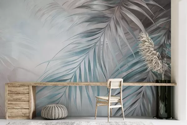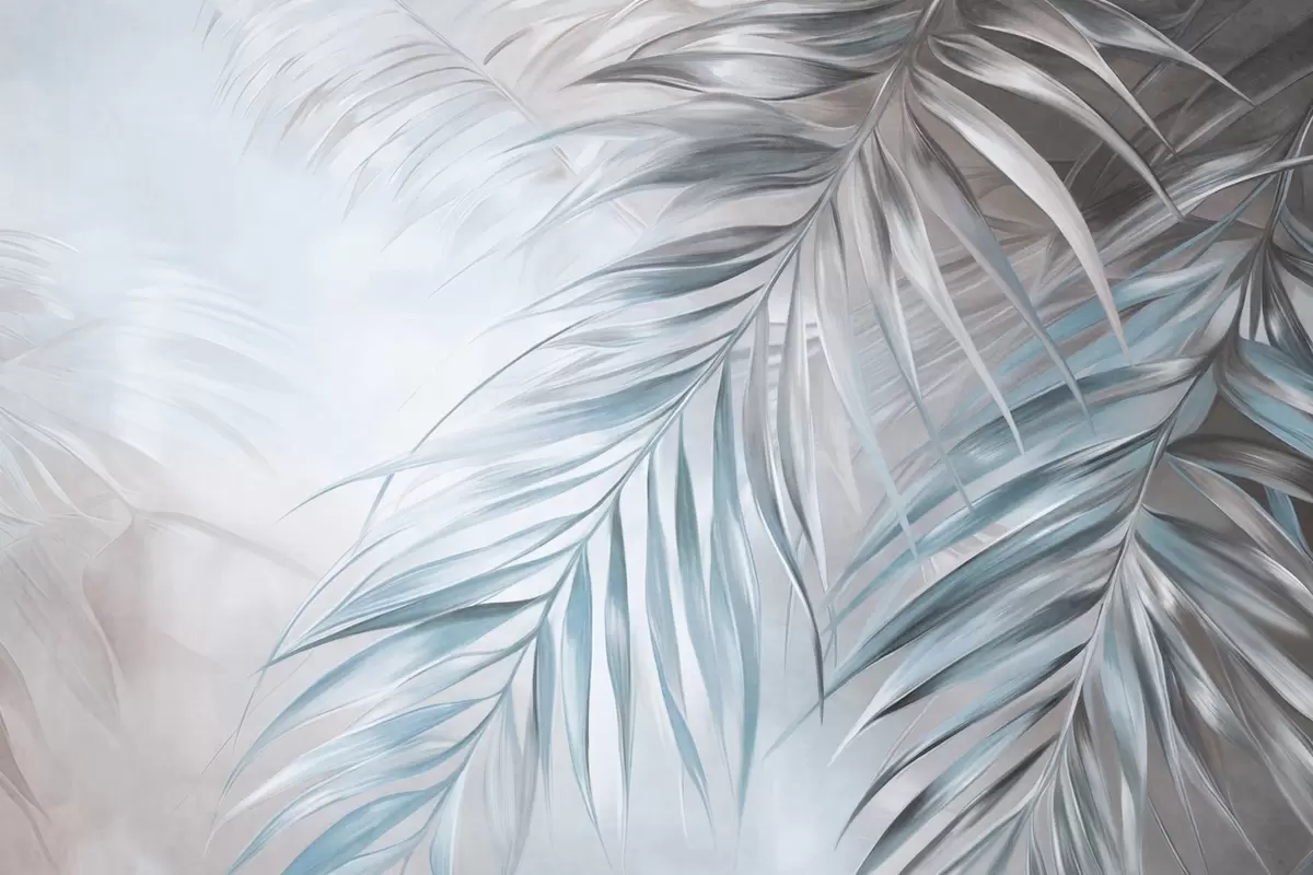 Фототапет Палмови листа в сиви и сини тонове, светъл текстуриран фон с меки цветове, елегантен тропически стил Nr w09475v1