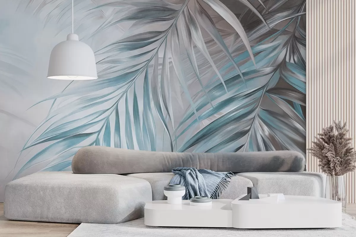 Фототапет Палмови листа в сиви и сини тонове, светъл текстуриран фон с меки цветове, елегантен тропически стил Nr w09475v1