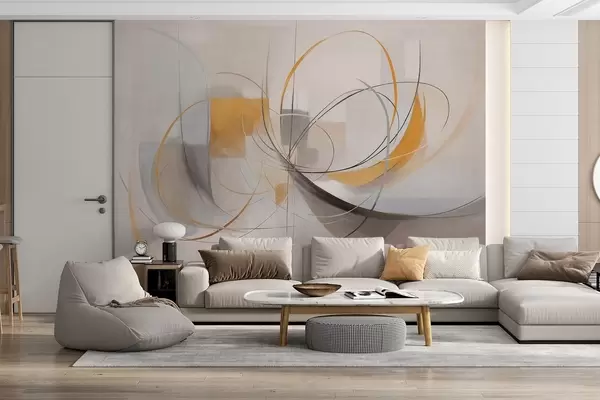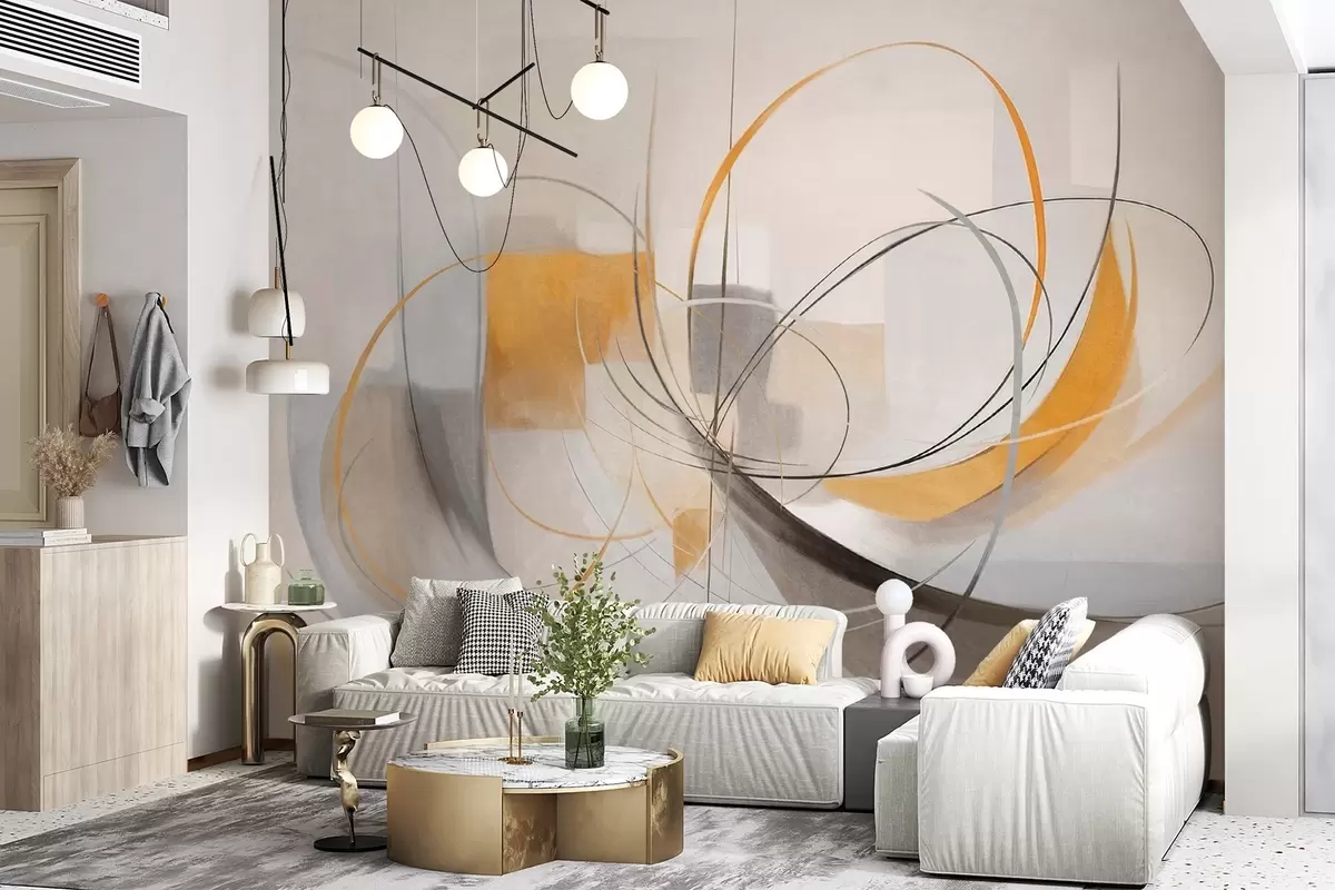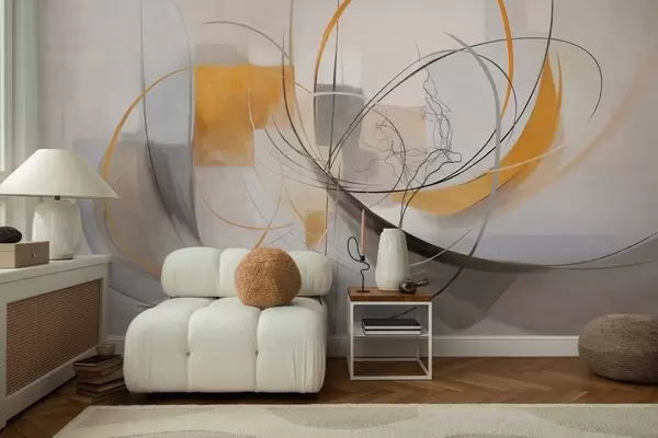 Фототапет Абстрактен текстуриран модерен стил на рисуване с извити линии и геометрични форми в нюанси на сиво, бяло и оранжево Nr w09476