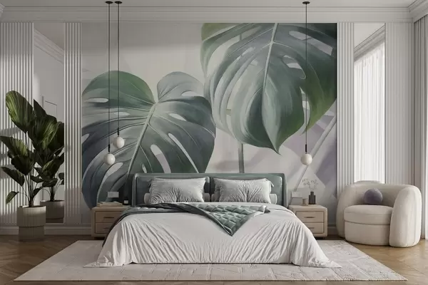 Фототапет Текстурирани листа от монстера, големи и зелени, на мек, светъл абстрактен фон Nr w09477