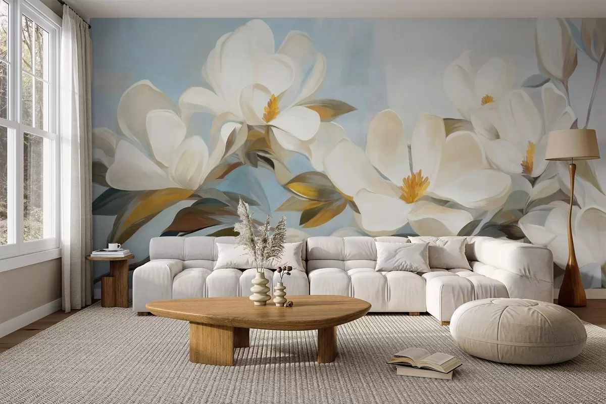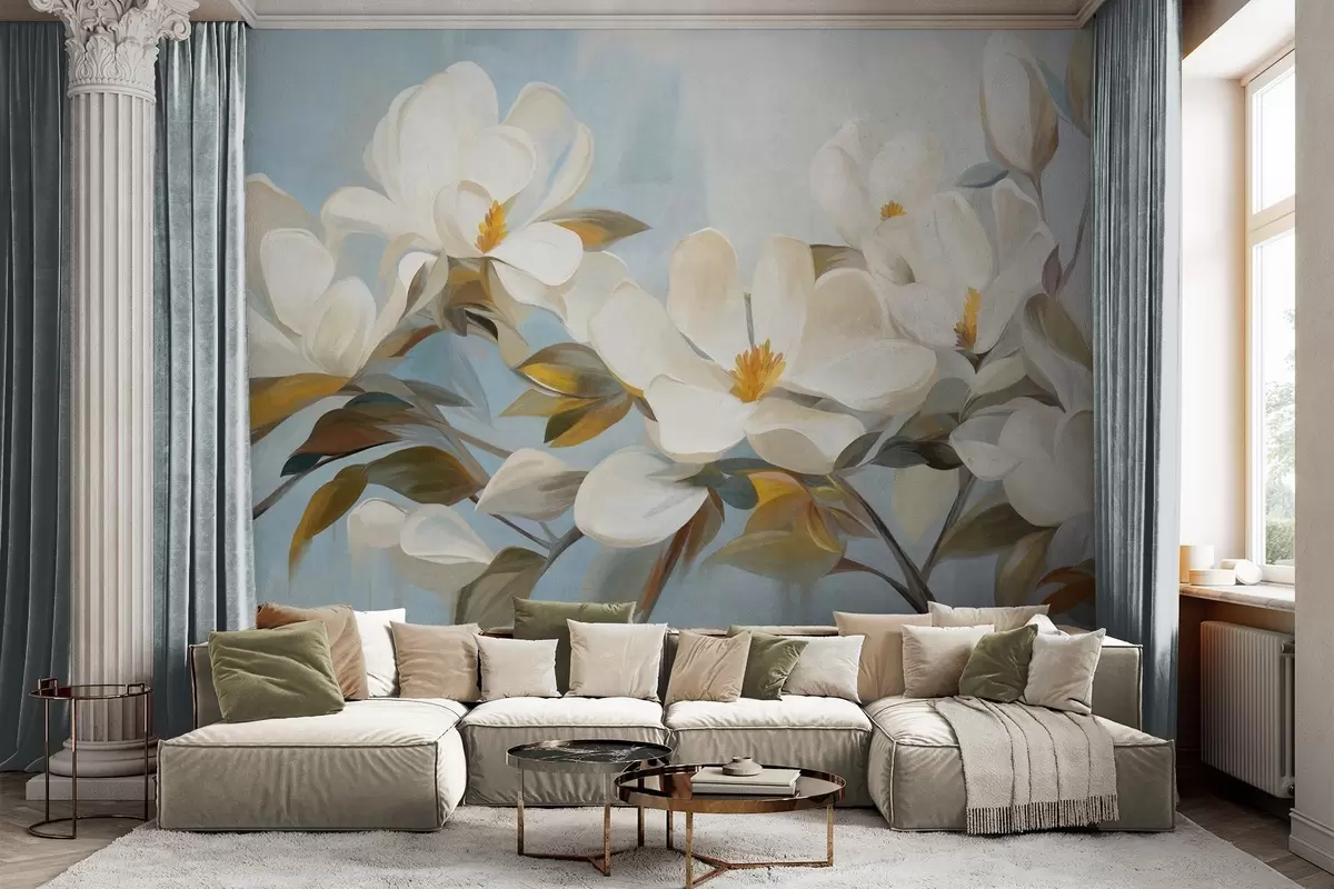 Фототапет Бели магнолии със зелени листа на светлосин фон с абстрактни мазки, имитиращи четката Nr w09478