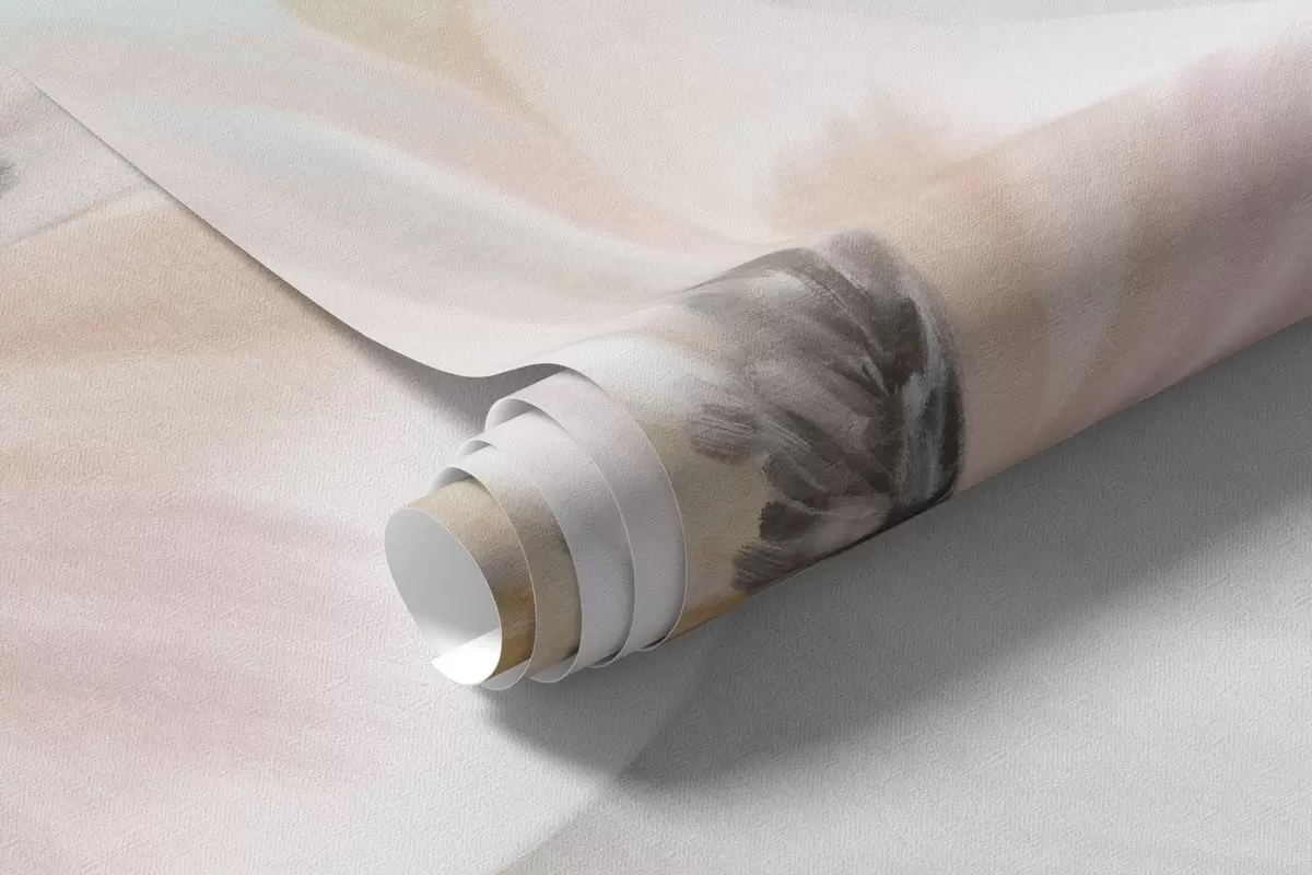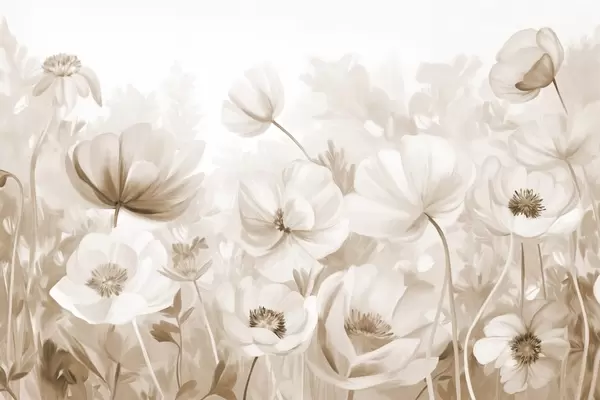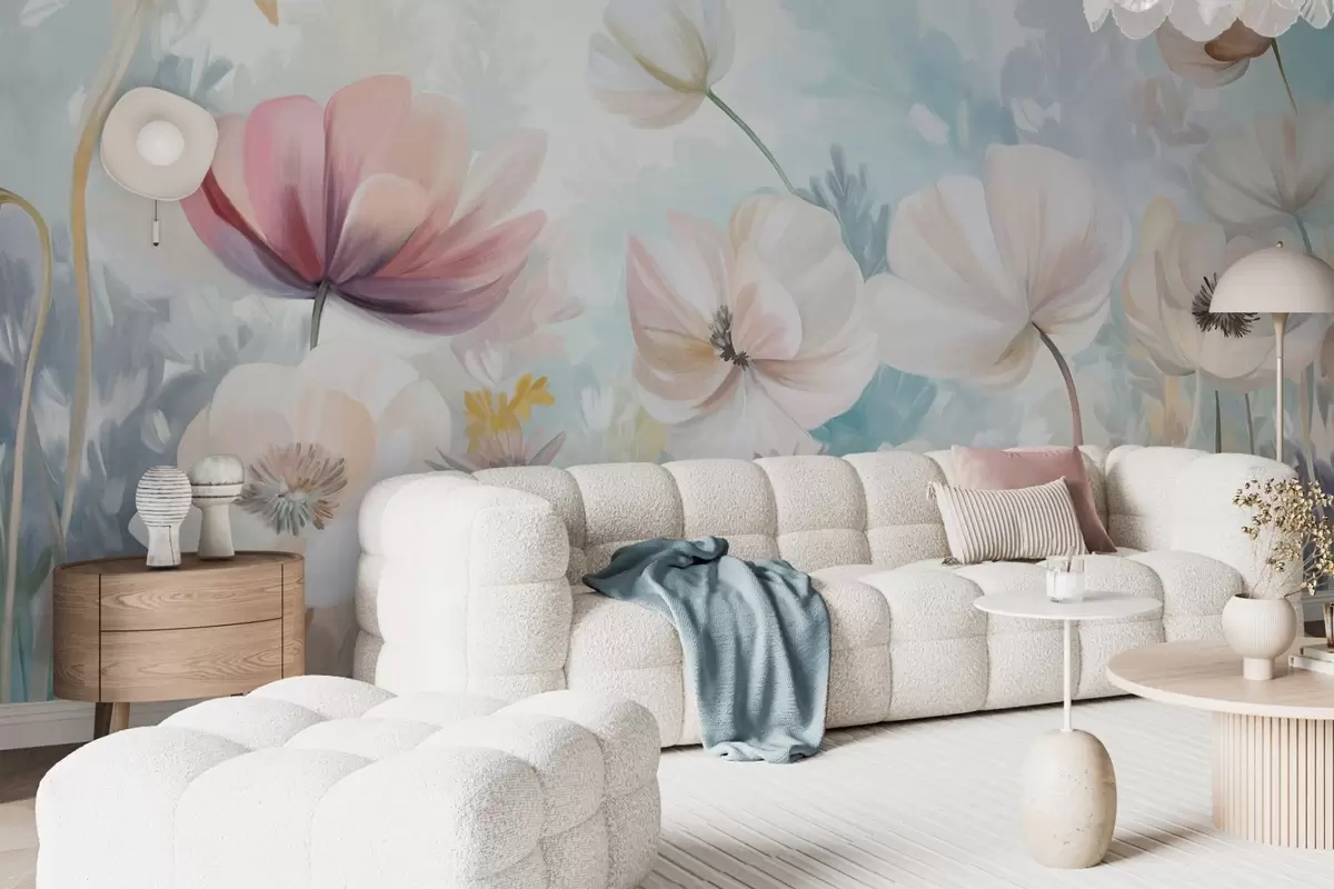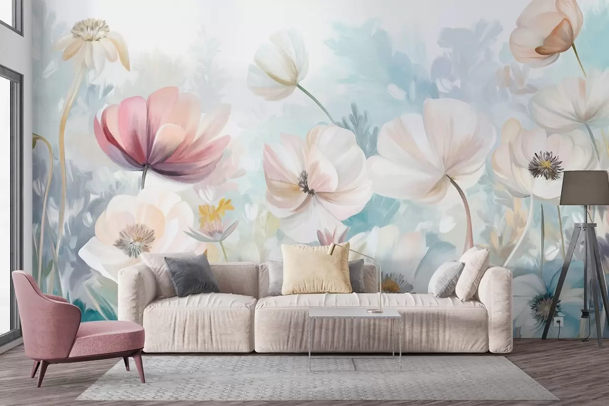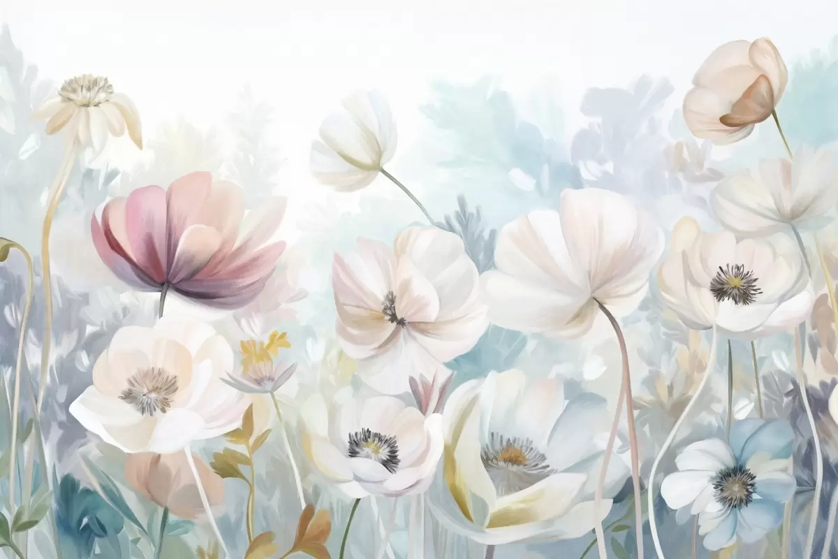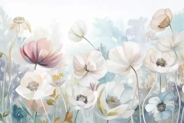 Фототапет Поле от пастелни цветя с нежни венчелистчета, меки зелени листа, в мечтателен, текстуриран акварелен стил Nr w09481