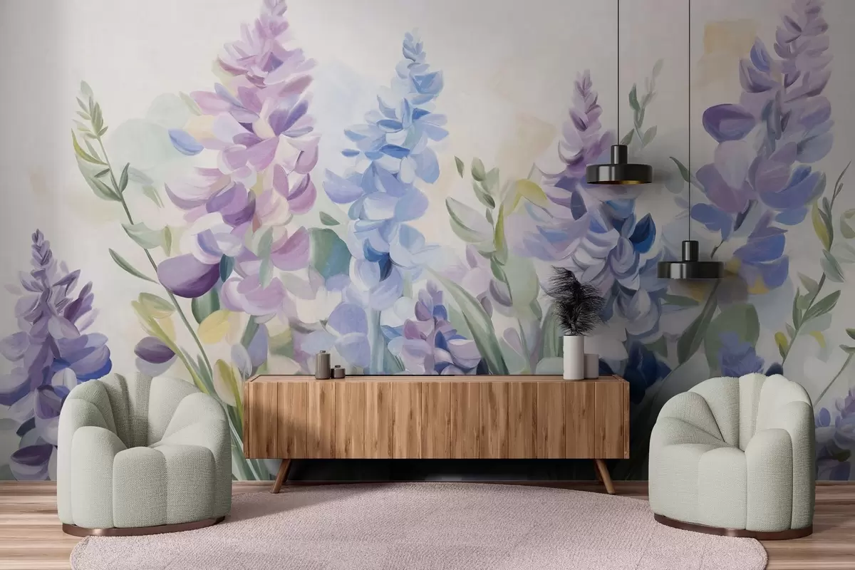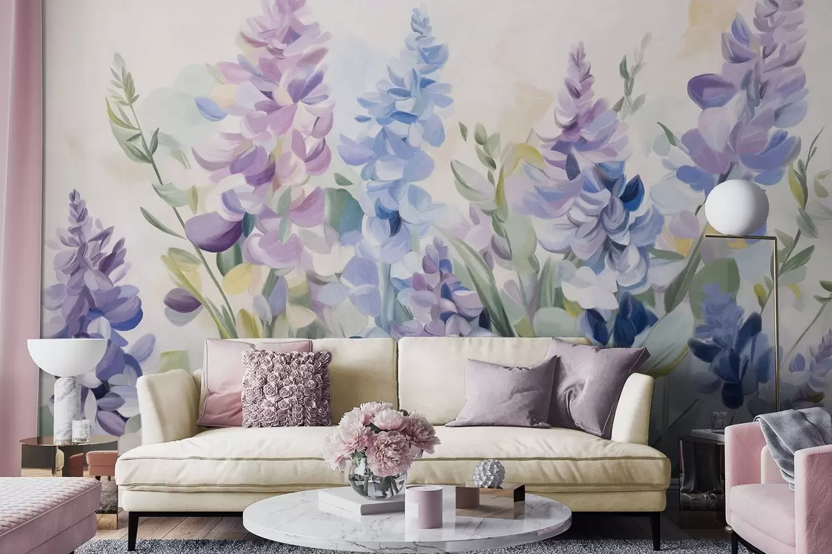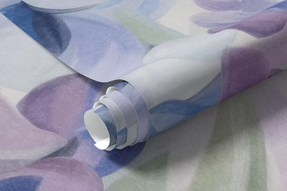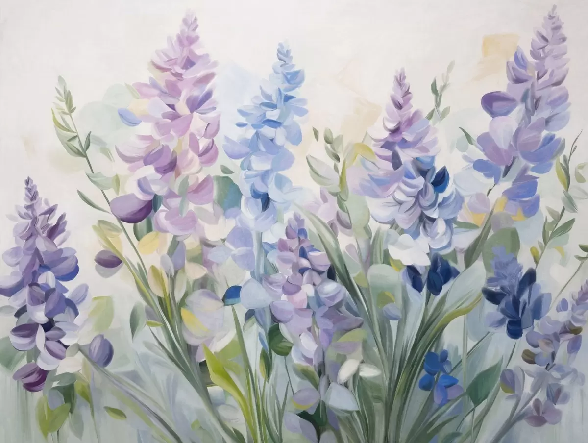 Фототапет Лилави и сини текстурирани цветя със сини листа, светъл фон, меки четковъдни щрихи, ярки цветове Nr w09482