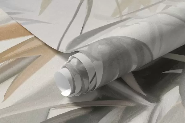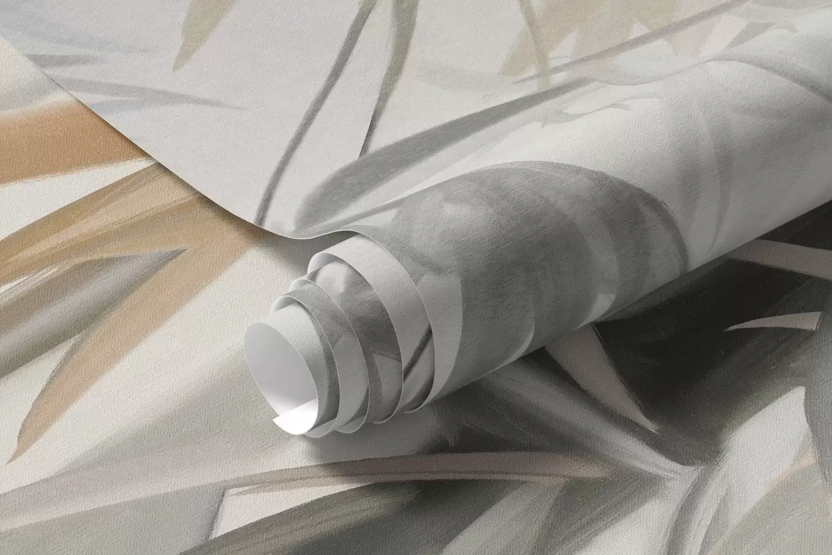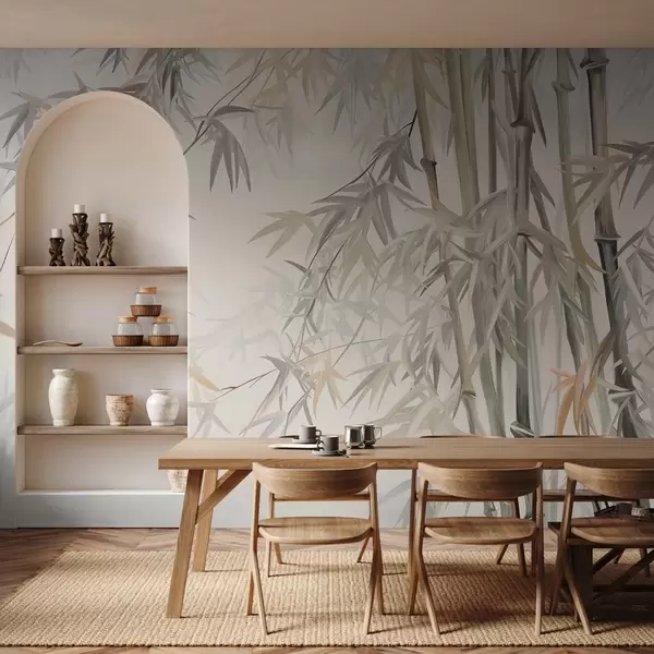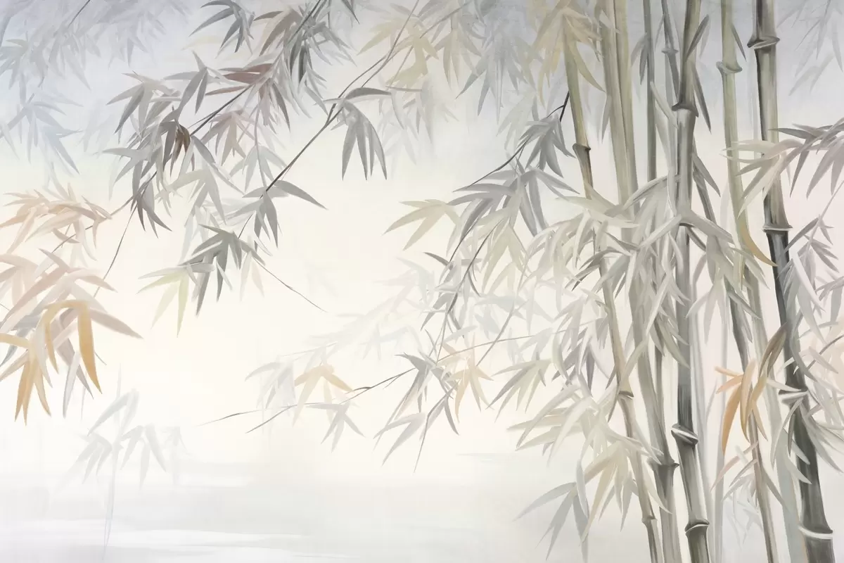 Фототапет Текстурирани бамбукови стъбла и листа в мека, приглушена цветова палитра от сиво, бяло и кремаво, минималистична композиция Nr w09485