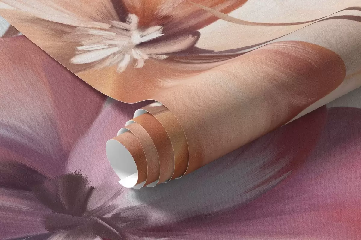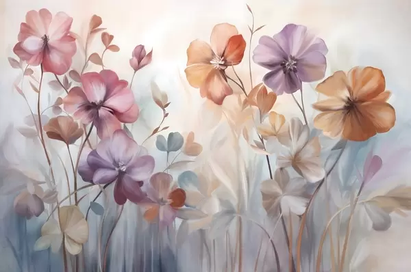 Фототапет Текстурирана цветярна аранжировка с розови, лилави и оранжеви цветя със зелени стъбла и листа, меки пастелни цветове Nr w09486