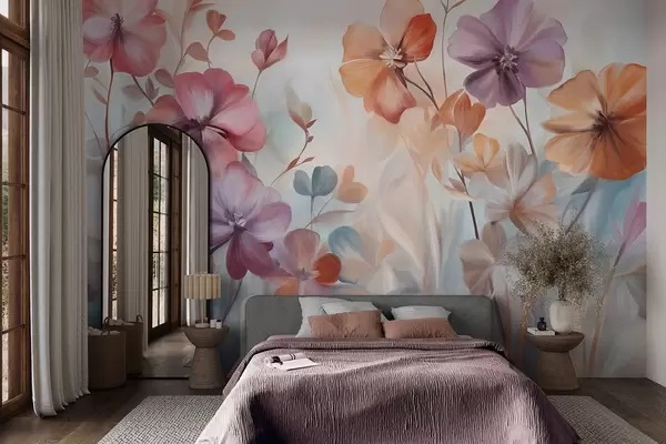 Фототапет Текстурирана цветярна аранжировка с розови, лилави и оранжеви цветя със зелени стъбла и листа, меки пастелни цветове Nr w09486