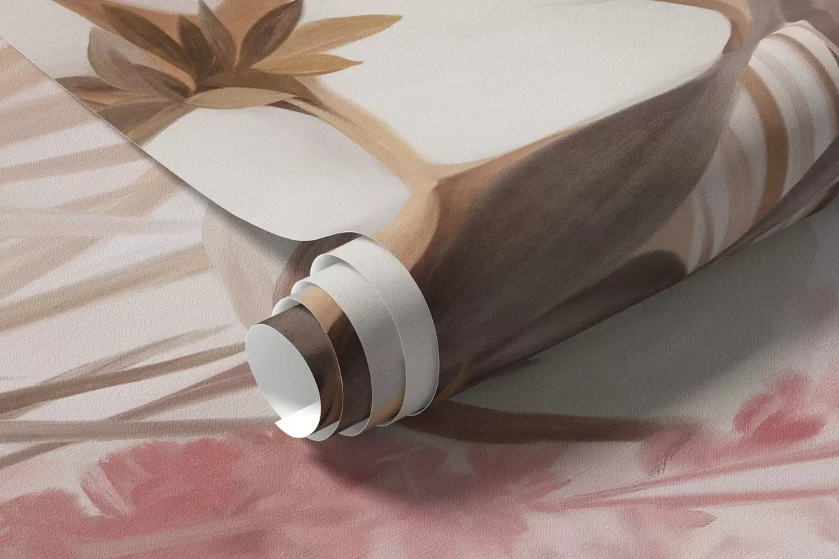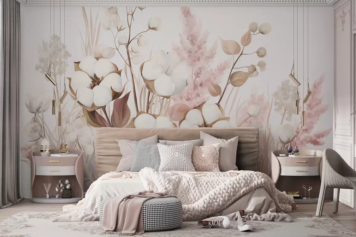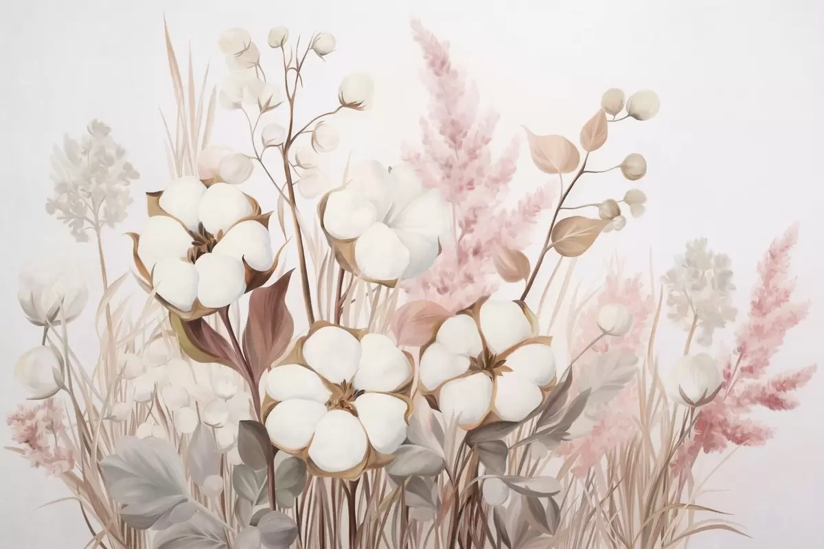 Фототапет Памучни текстурирани цветя с бяла и розова пампасова трева, бежови и кафяви листа и билки, бял фон Nr w09489