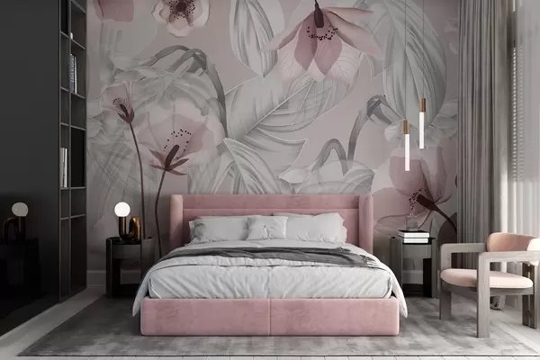 Фототапет Розови цветя и сиви листа, ботаничен фон с цветя, елегантен дизайн, меки цветове, леки и деликатни детайли Nr w09497