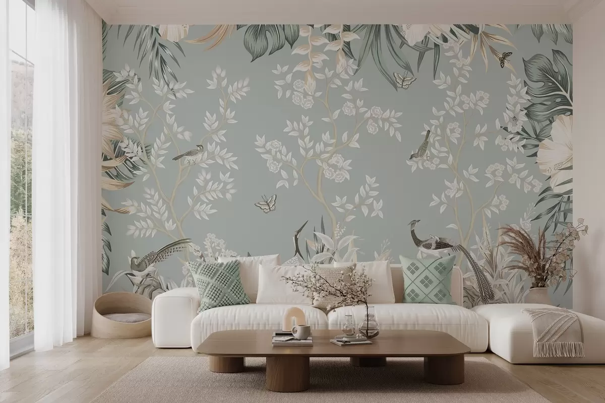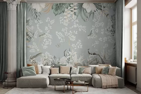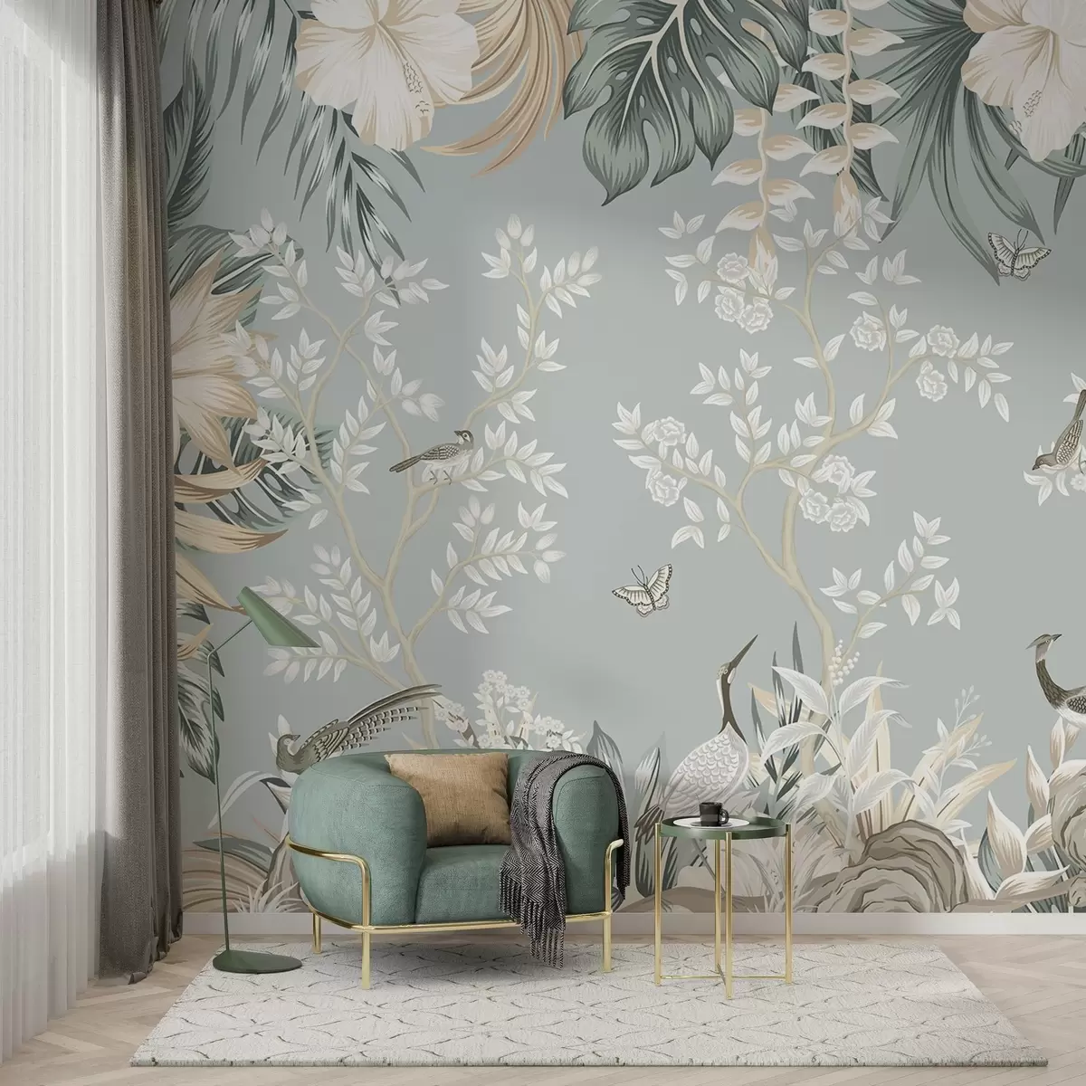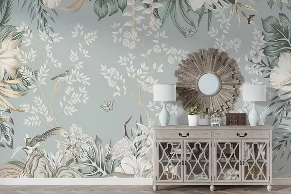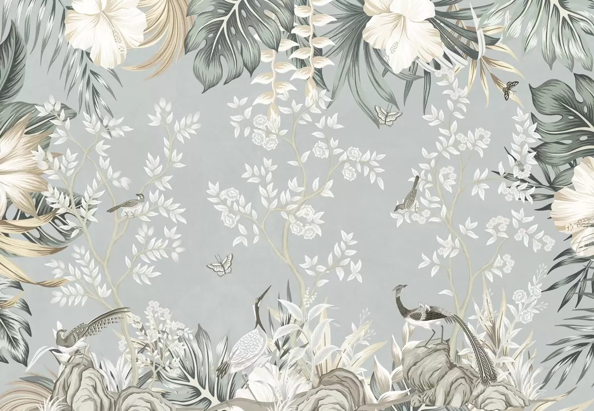 Фототапет Тропическа пастелна картина с птици, пеперуди, цветя от хибискус, палмови листа и дървета на светлосин фон Nr w09528