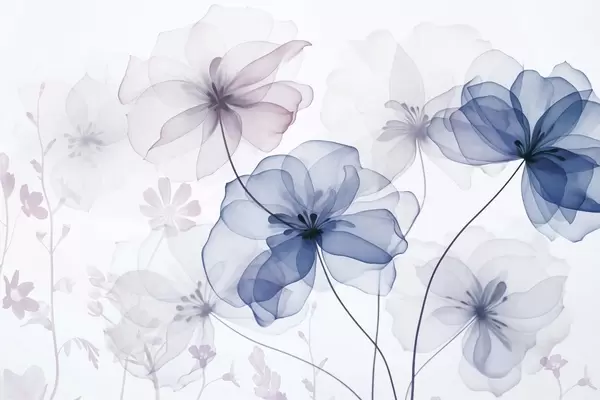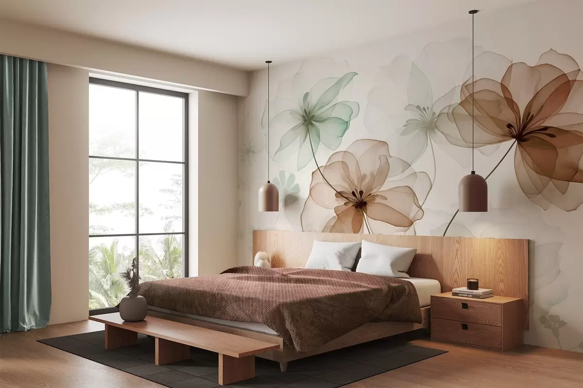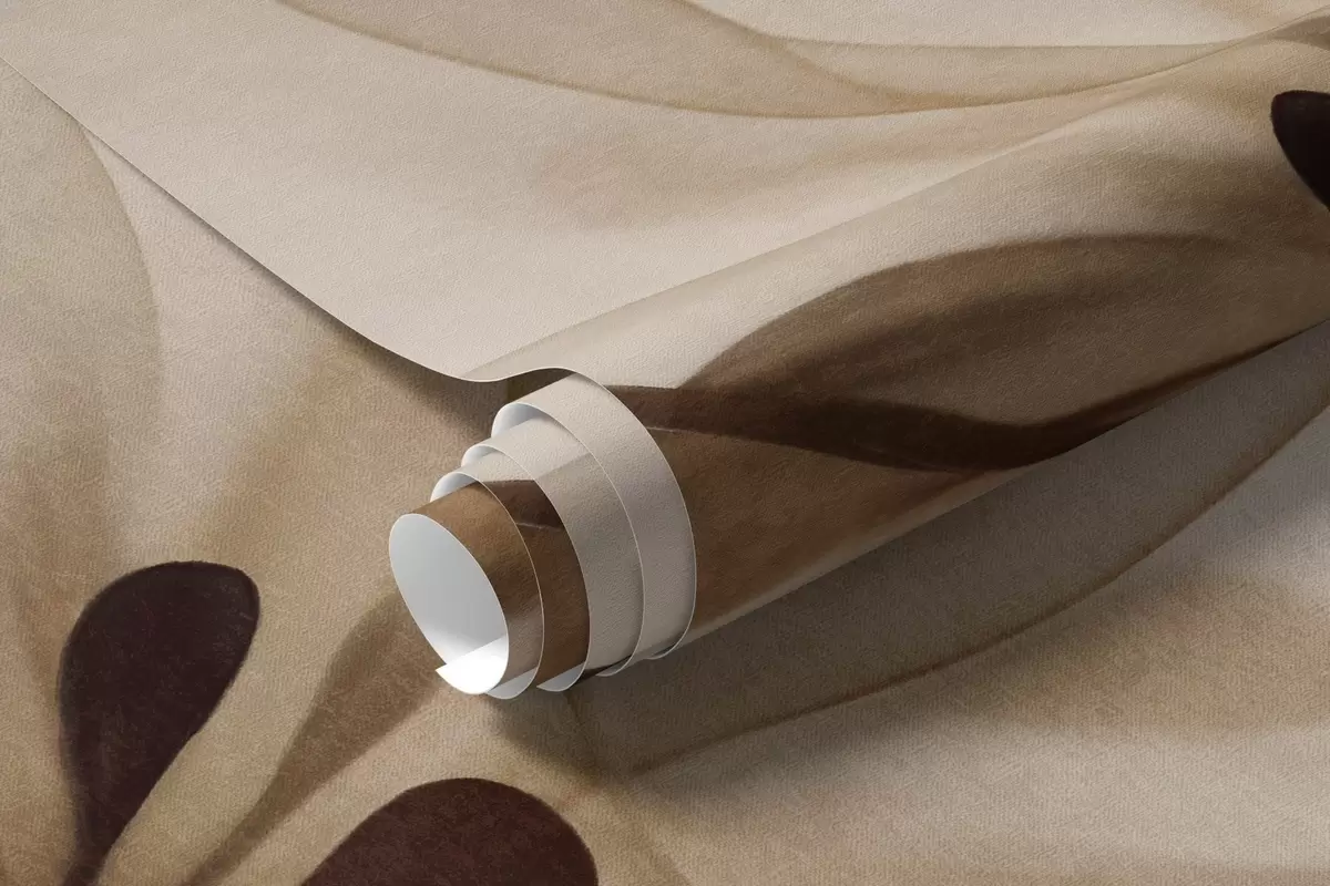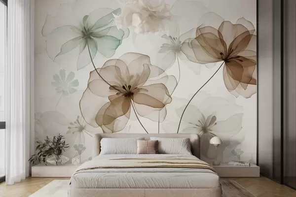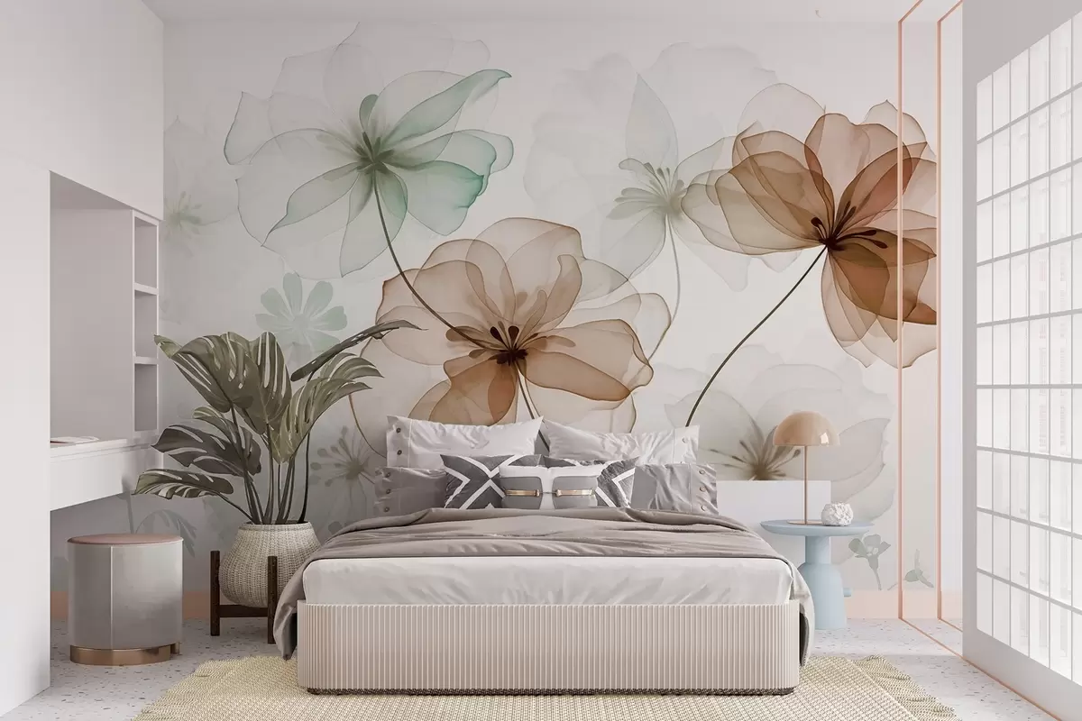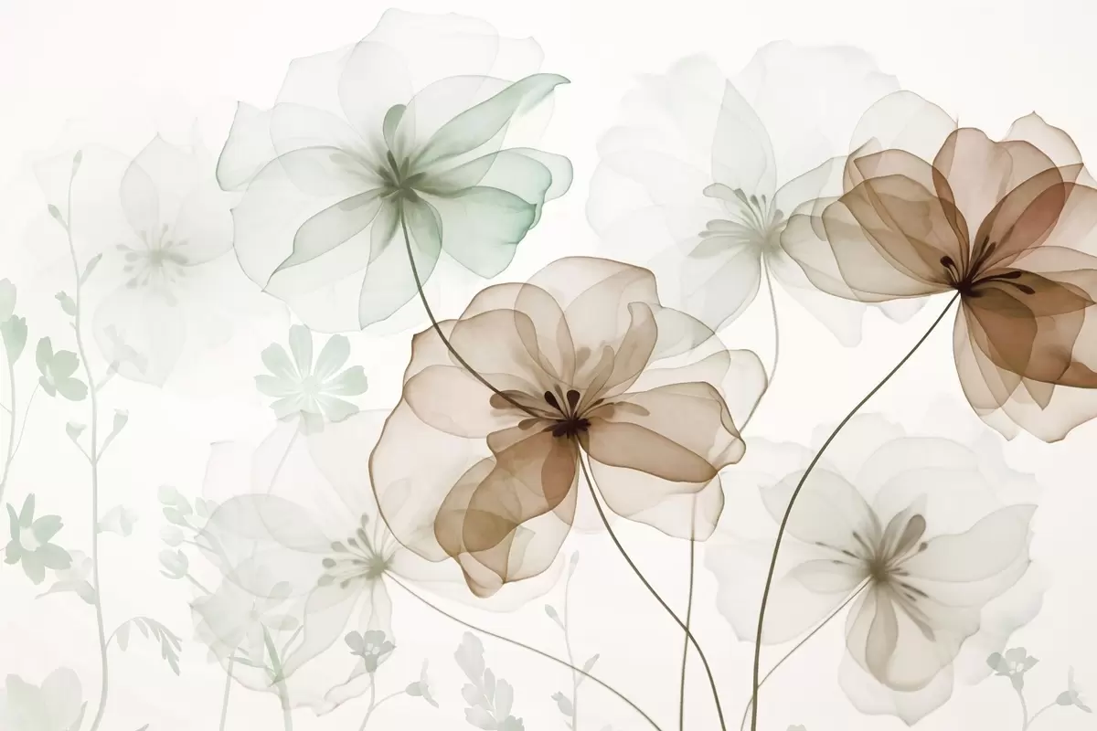 Фототапет Прозрачни цветя с кафяви и зелени венчелистчета, дълги стъбла, светъл фон, меки цветове, текстуриран флорален дизайн Nr w09529