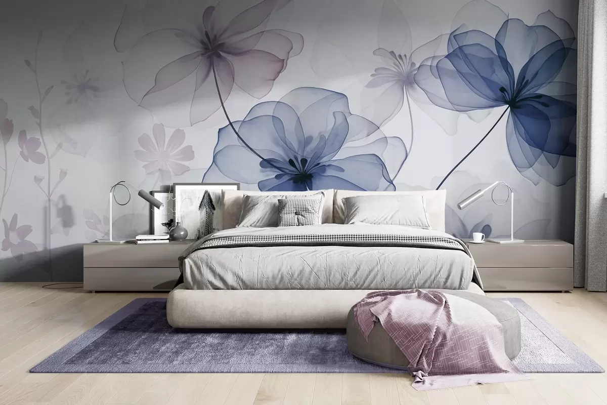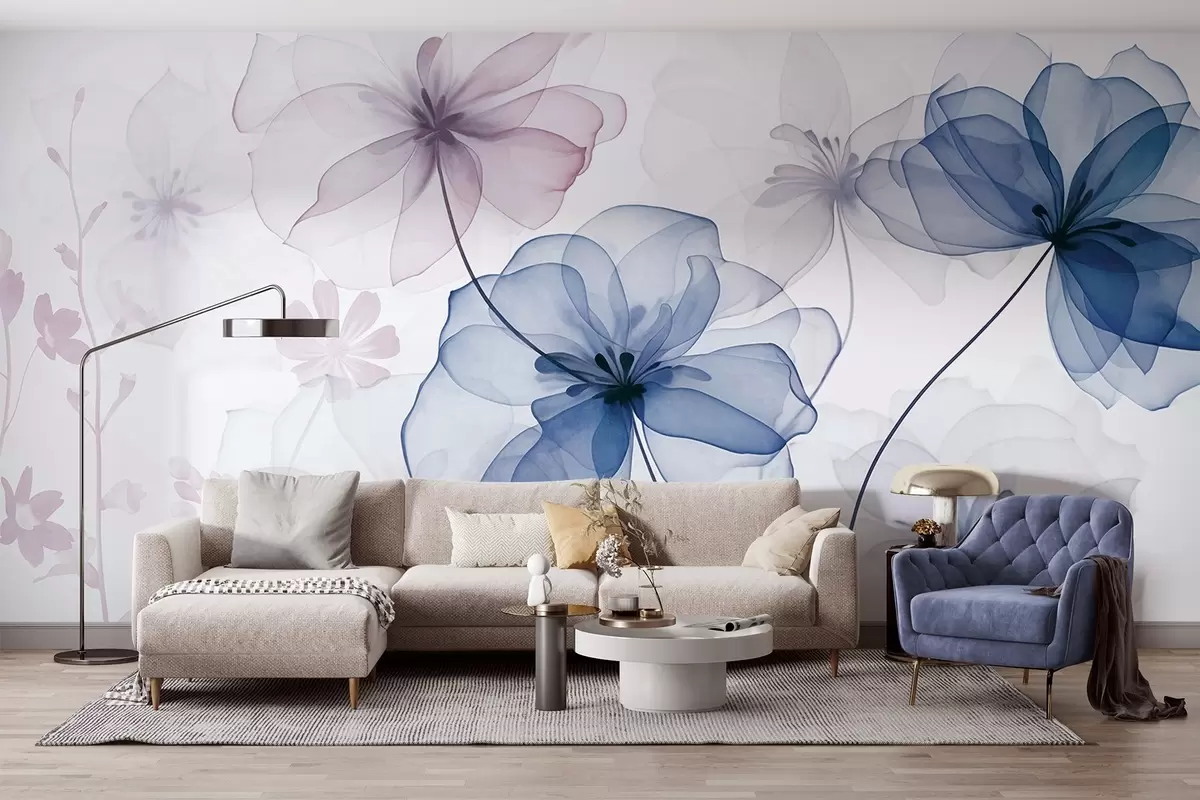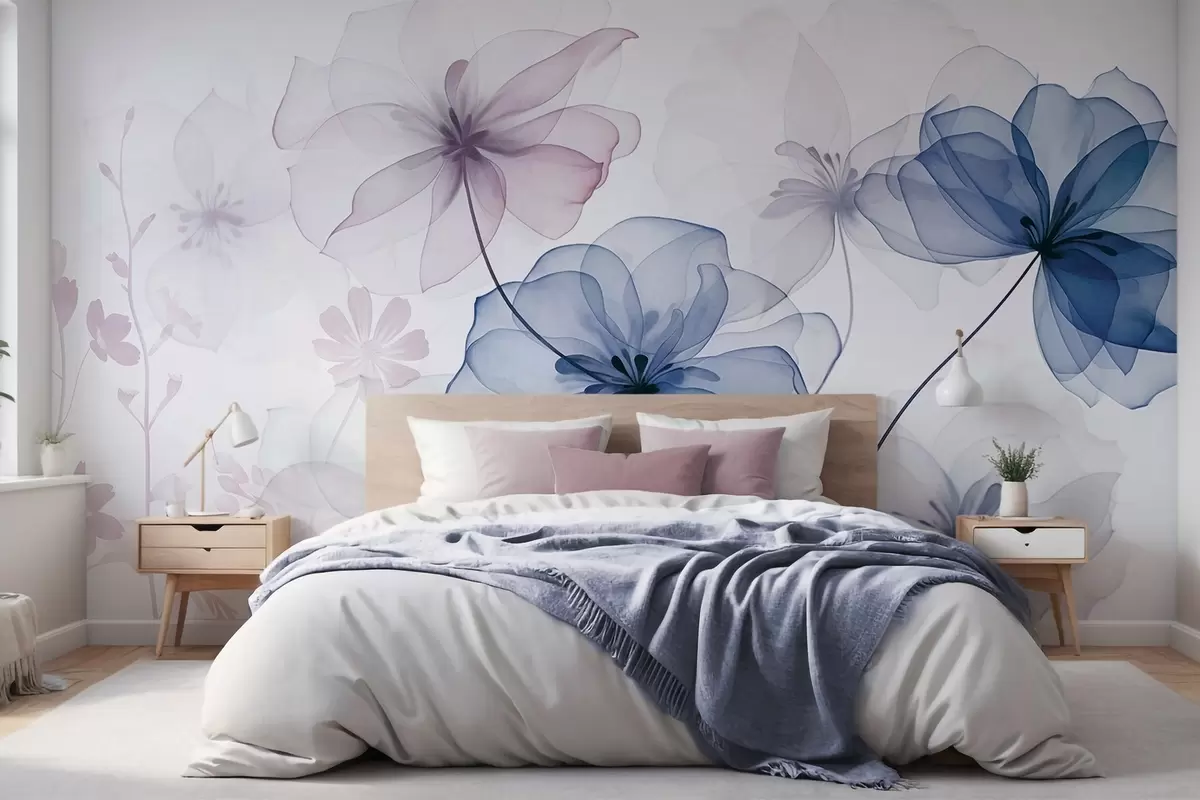 Фототапет Прозрачни цветя с нежни сини и розови венчелистчета, дълги стъбла, светъл фон, меки цветове, текстуриран флорален дизайн Nr w09529v1