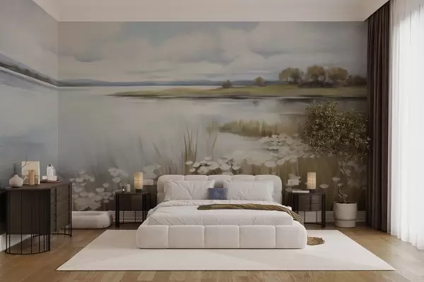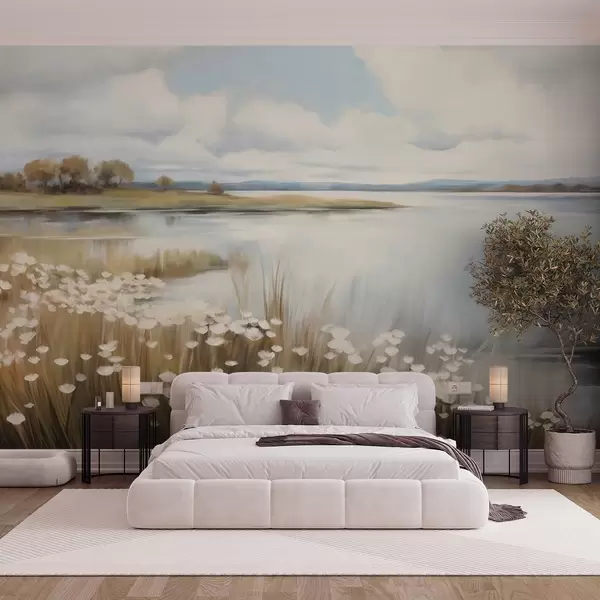 Фототапет Текстуриран пейзаж, поле с бели цветя и висока трева, езеро на заден план, тревист хълм с дървета, меки цветове Nr w09530