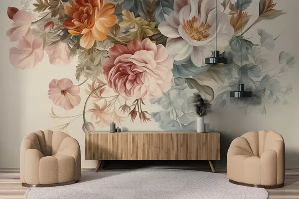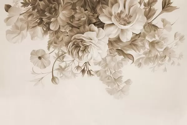 Фототапет Ретро аранжировка от рози, божури и други текстурирани цветя с листа, на светъл фон Nr w09532