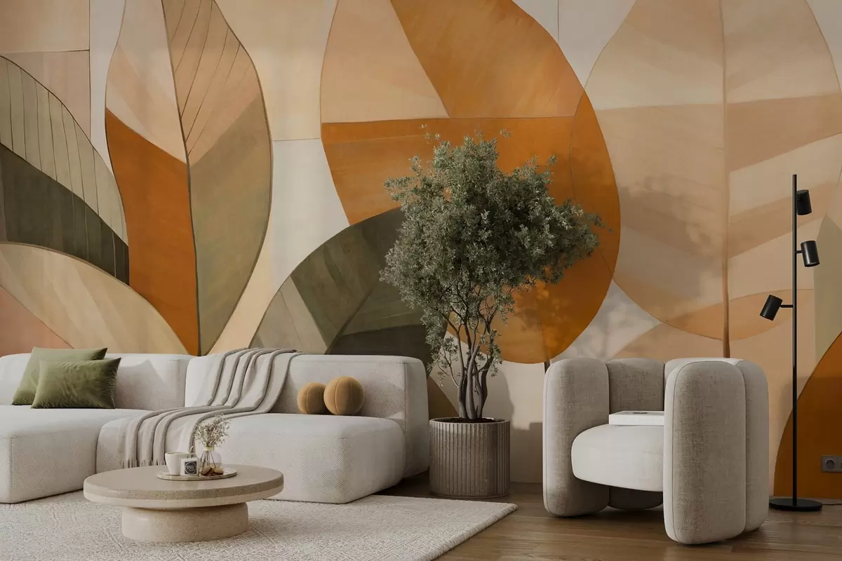 Фототапет Абстрактни големи листа в нюанси на оранжево, кафяво и зелено, с текстура, разположени на светъл фон Nr w09539