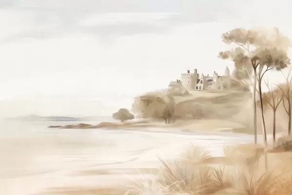 Фототапет Пейзаж с замък на хълм до морето, пясъчен плаж на преден план, приглушени цветове, текстурирано изкуство Nr w09540