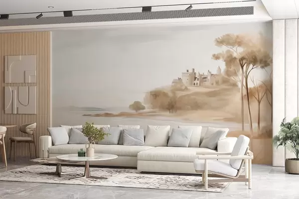 Фототапет Пейзаж с замък на хълм до морето, пясъчен плаж на преден план, приглушени цветове, текстурирано изкуство Nr w09540