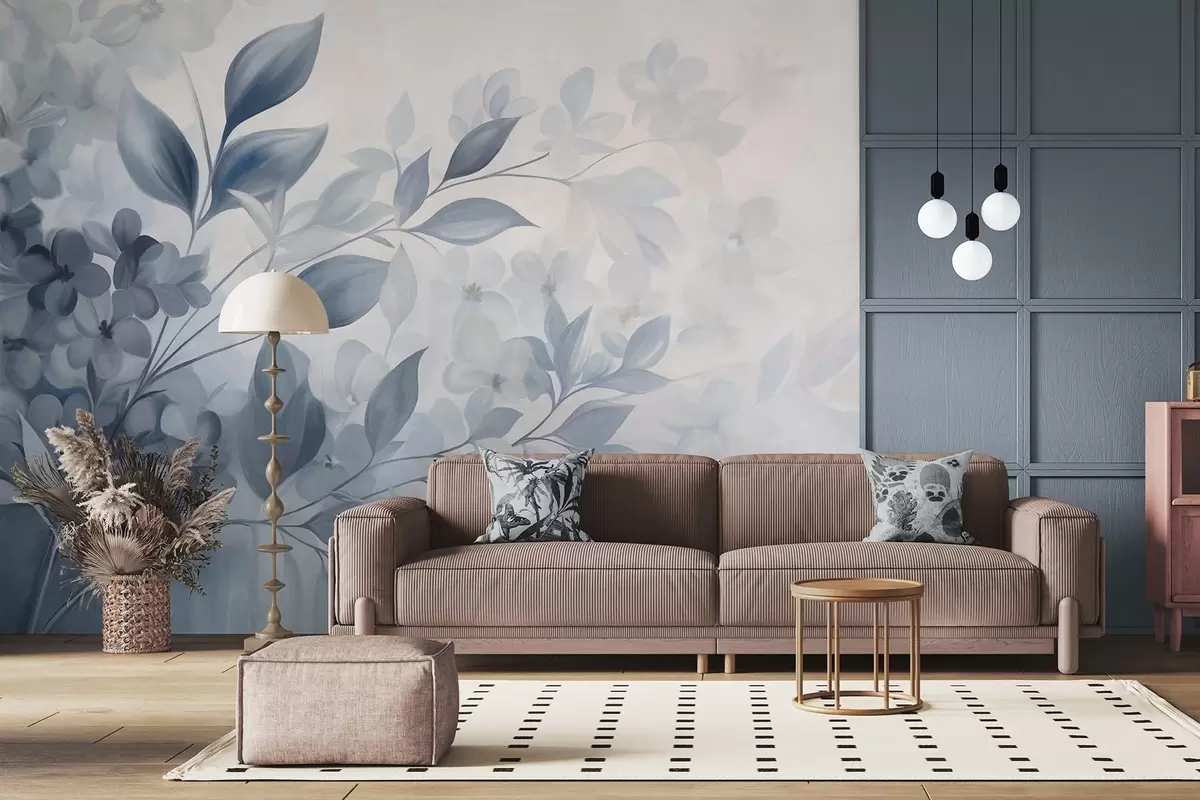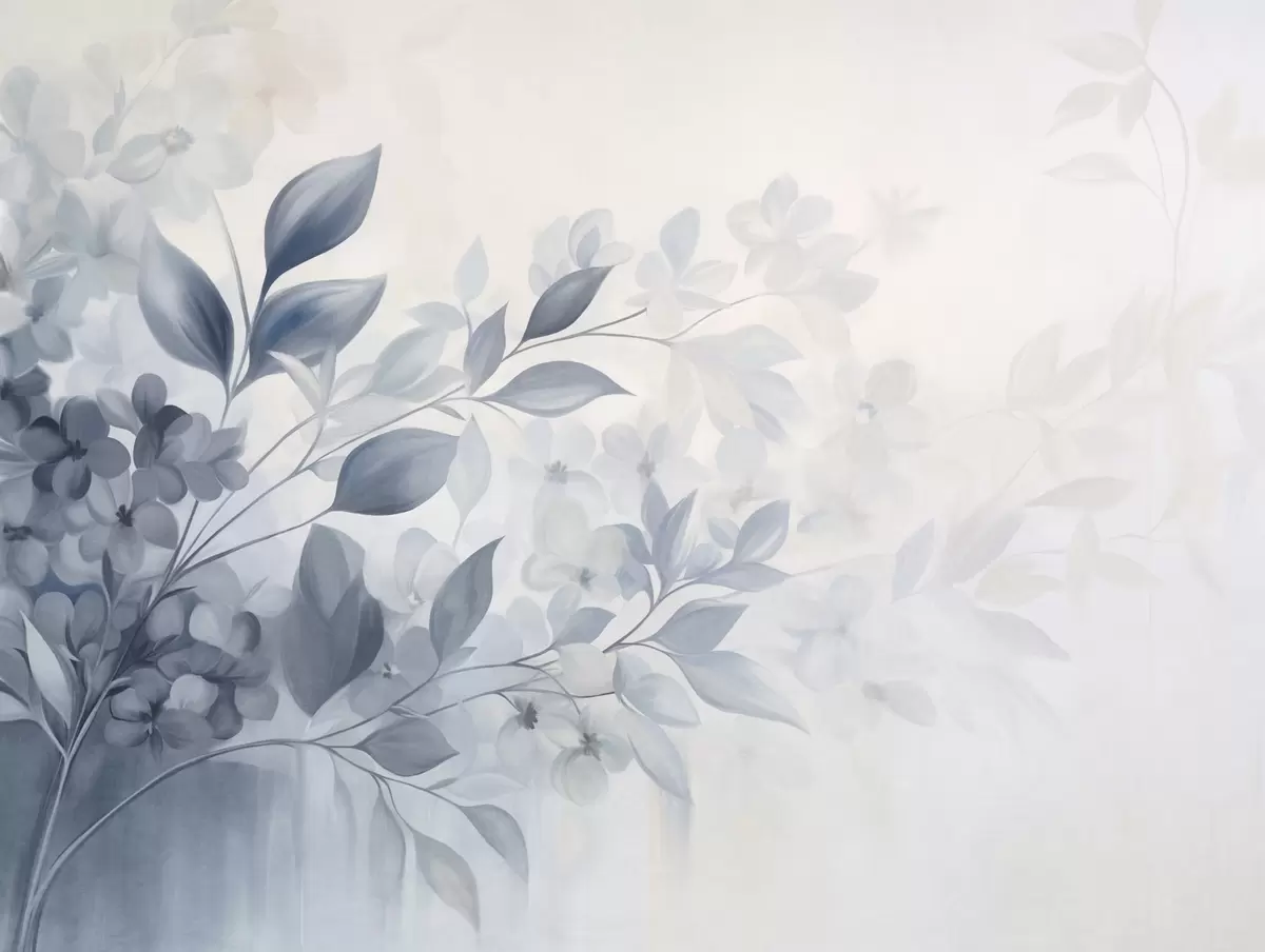 Фототапет Текстурирана синьо-бяла клонка с цветя и листа, преливащи се в светъл фон в стил акварелна живопис Nr w09543