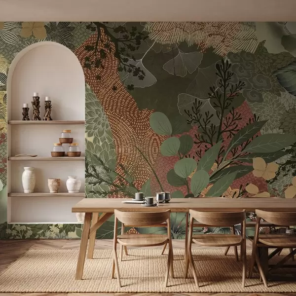 Фототапет Абстрактен колаж с текстура от ботанически елементи с листа, цветя и органични текстури, в нюанси на зелено и кафяво. Nr w09545