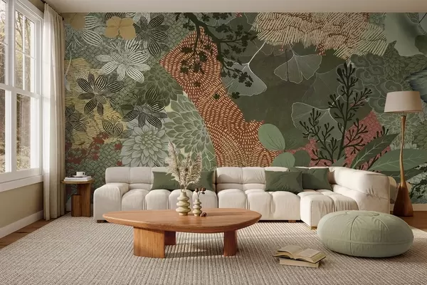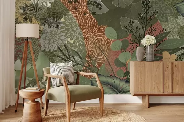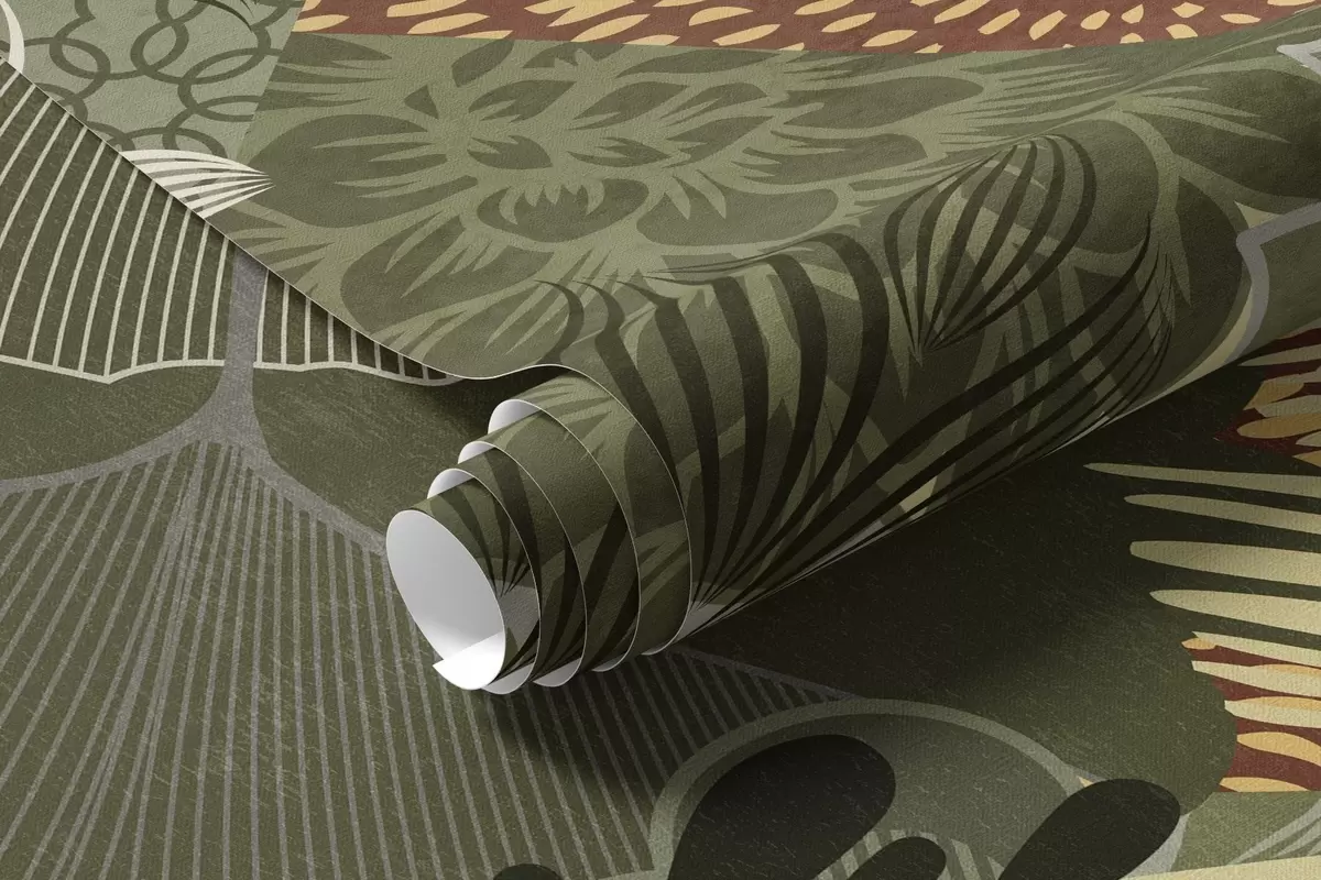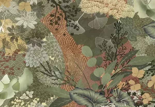 Фототапет Абстрактен колаж с текстура от ботанически елементи с листа, цветя и органични текстури, в нюанси на зелено и кафяво. Nr w09545