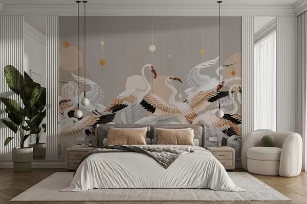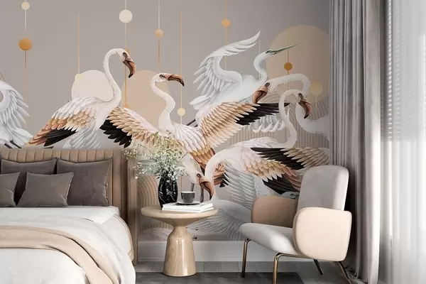 Фототапет Стадо бели фламинго с нежни крила, на неутрален фон с жълти линии и кръгове Nr w09546v1