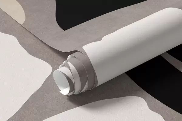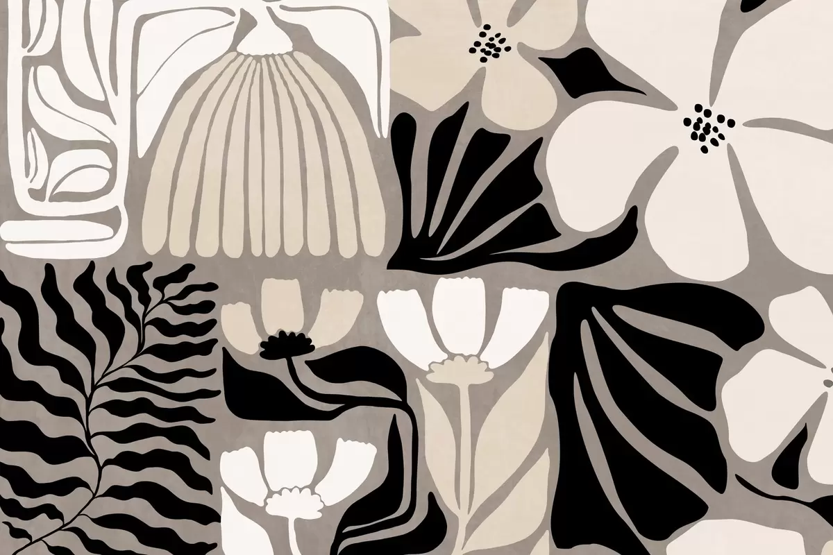 Фототапет Модерни минималистични стилизирани цветя и листа в бежово, черно и бяло, с текстура върху сив фон Nr w09547