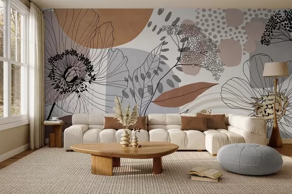 Фототапет Абстрактен флорален принт с линейни цветя, листа и органични форми в приглушени кафяви, бежови и сиви тонове. Nr w09548