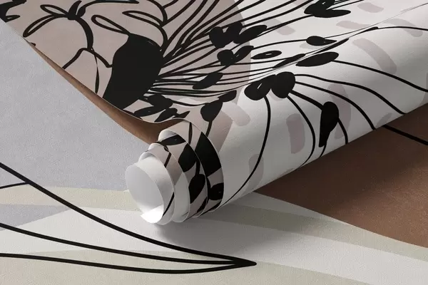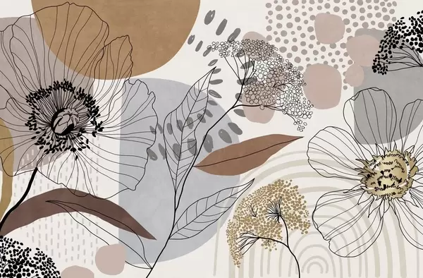 Фототапет Абстрактен флорален принт с линейни цветя, листа и органични форми в приглушени кафяви, бежови и сиви тонове. Nr w09548