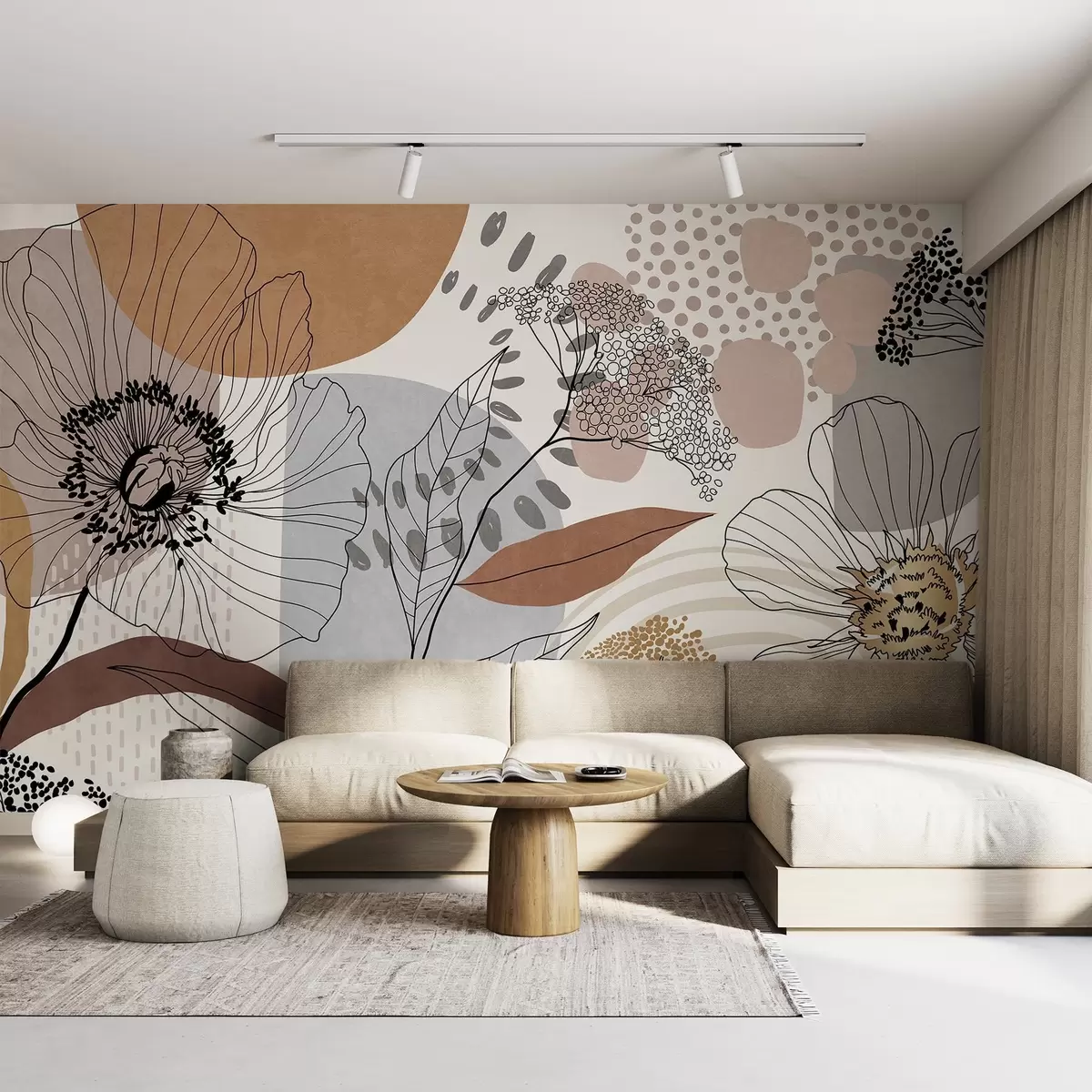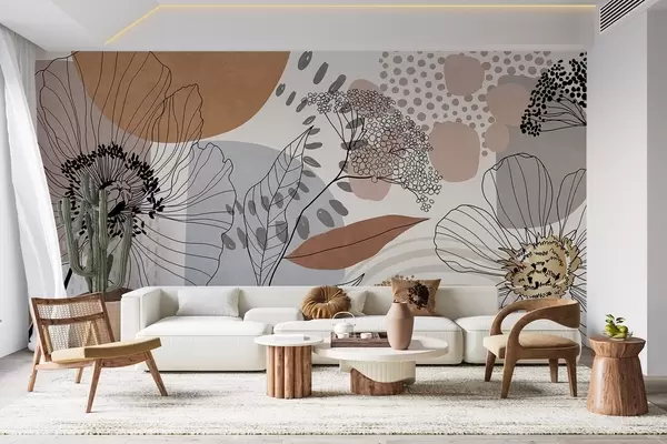 Фототапет Абстрактен флорален принт с линейни цветя, листа и органични форми в приглушени кафяви, бежови и сиви тонове Nr w09548
