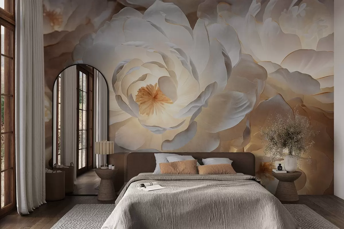 Фототапет Големи, бели фантазийни божури с жълти центрове, меко осветление и нежни, текстурирани слоести венчелистчета. Nr w09550