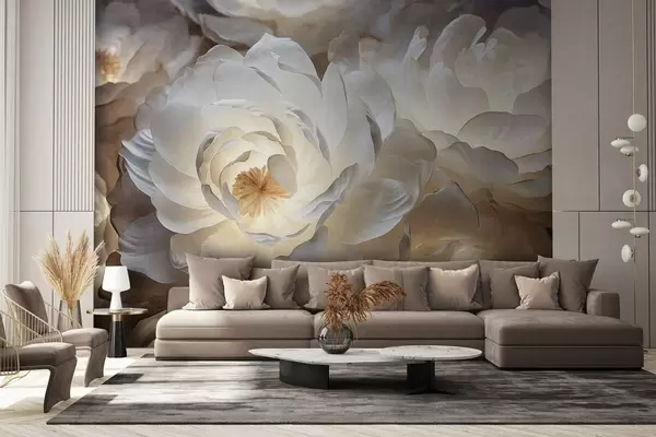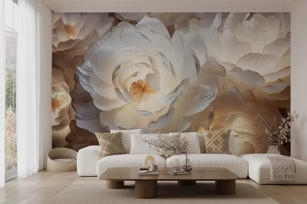 Фототапет Големи, бели фантазийни божури с жълти центрове, меко осветление и нежни, текстурирани слоести венчелистчета Nr w09550